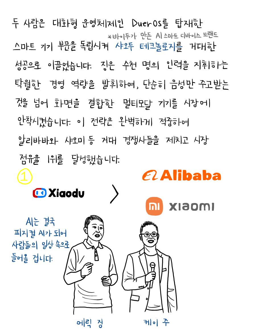 두 사람은 대화형 운영체제인 DuerOS를 탑재한 스마트기기 부문을 독립시켜 샤오두 테크놀로지 Xiaodu Technology 를 거대한 성공으로 이끌었습니다. 징은 수천 명의 인력을 지휘하는 탁월한 경영 역량을 발휘하며, 단순히 음성만 주고받는 것을 넘어 화면을 결합한 멀티모달 Multimodal 기기를 시장에 안착시켰습니다. 이 전략은 완벽하게 적중하여 알리바바 Alibaba 와 샤오미 Xiaomi 등 거대 경쟁사들을 제치고 시장 점유율 1위를 달성했습니다.
