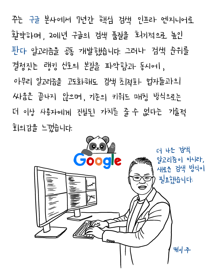 주는 구글 본사에서 7년간 핵심 검색 인프라 엔지니어로 활약하며, 2011년 구글의 검색 품질을 획기적으로 높인 판다 알고리즘 Panda Algorithm 을 공동 개발했습니다. 그러나 검색 순위를 결정짓는 랭킹 신호의 본질을 파악함과 동시에, 아무리 알고리즘을 고도화해도 검색 최적화 업자들과의 싸움은 끝나지 않으며, 기존의 키워드 매칭 방식으로는 더 이상 사용자에게 진실된 가치를 줄 수 없다는 기술적 회의감을 느꼈습니다.