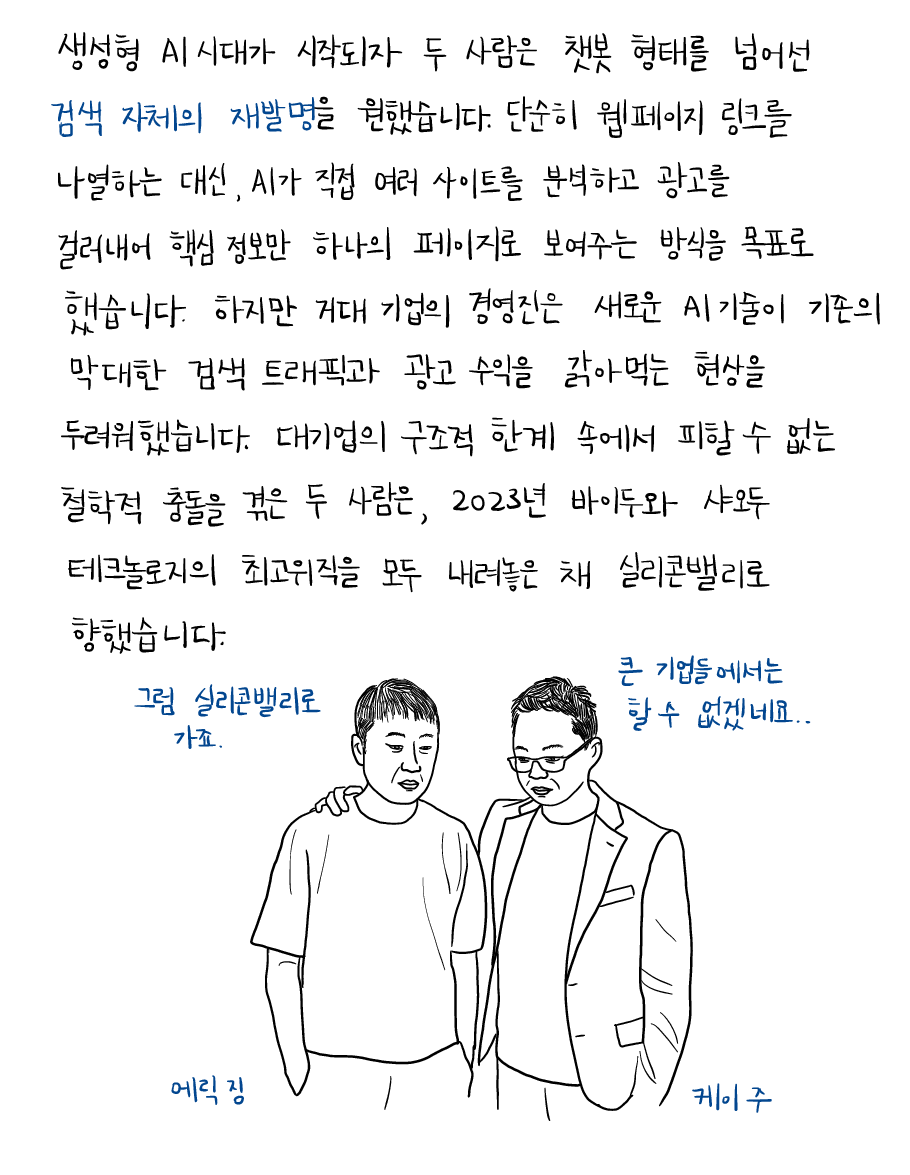 생성형 AI 시대가 시작되자 두 사람은 챗봇 형태를 넘어선 검색 자체의 재발명을 원했습니다. 단순히 웹페이지 링크를 나열하는 대신, AI가 직접 여러 사이트를 분석하고 광고를 걸러내어 핵심 정보만 하나의 페이지로 보여주는 방식을 목표로 했습니다.