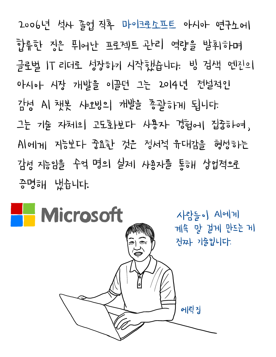 그는 기술 자체의 고도화보다 사용자 경험에 집중하여, AI에게 지능보다 중요한 것은 정서적 유대감을 형성하는 감성 지능임을 수억 명의 실제 사용자를 통해 상업적으로 증명해냈습니다.
