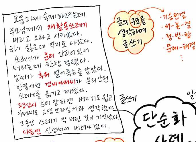 마지막으로 글의 구조를 생각하며 글을 배치한다. 생각나는 대로 쓰는 것은 글이 아니다. 글의 구조는 기•승•전•결, 서론•본론•결론, 정•반•합, 문제점•해결책•결과 등 다양하게 구성할 수 있다. 좋은 글을 많이 읽으면 글의 구조가 보인다. 많이 읽도록 하자.