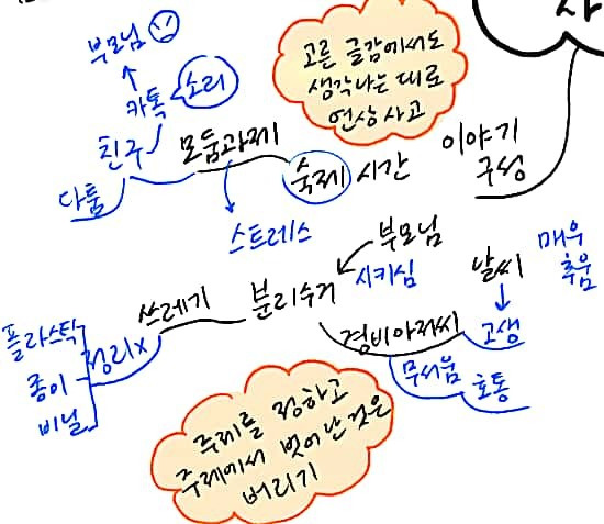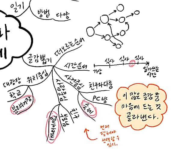 나열된 글감은 선택의 폭을 넓혀준다. 글감이 없었을 때엔 무슨 내용을 쓸까 고민이었지만 이젠 무슨 내용을 뺄까가 고민이 된다. 주제에 어울리지 않거나 도움이 되지 않는 내용은 제외토록 하자. 그리고 선택된 글감으로부터 연상되는 생각을 더 펼쳐보자.