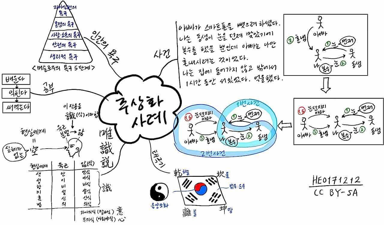 눈에 보이지 않는 것을 개념적으로 표현하는 것이 추상화이다. 이를 위해 특수한 것들을 일반화시키는 방법, 공통 속성을 묶어 집단화하는 방법, 관계를 연결하여 연관시키는 방법, 수준이 다르면 상•하위수준으로 높이거나 낮추는 방법 등이 있다. 이렇게 하면 눈에 보이지 않던 것도 간결해지고, 명확해진다. 사례를 보자.