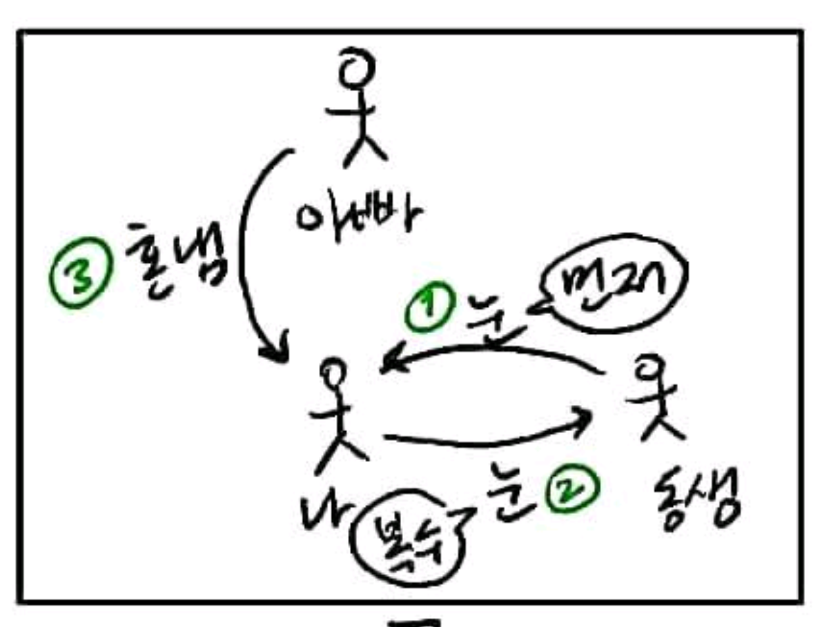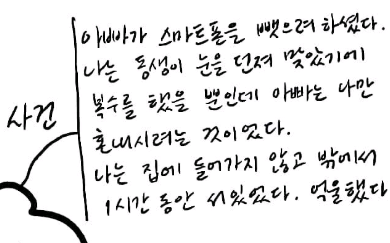 아빠와 두 아들에게 있었던 사건이다. 형이 사건을 인식하는 수준을 적었다. 종합적인 파악이 안되니 원망만 가득하다. 이 사건을 그림으로 그려보자.