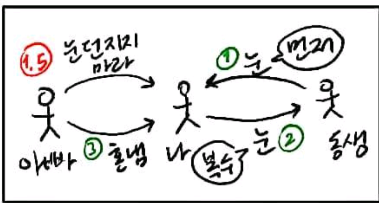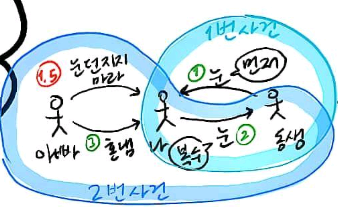 이 것을 더 추상화해보면 2가지 사건으로 구별해볼 수 있다. 첫번째는 동생이 눈을 던져 형이 눈을 되돌려 갚는 이야기이고, 두번째는 아빠가 눈을 던지지말라 한 것을 던져서 혼난 이야기이다.