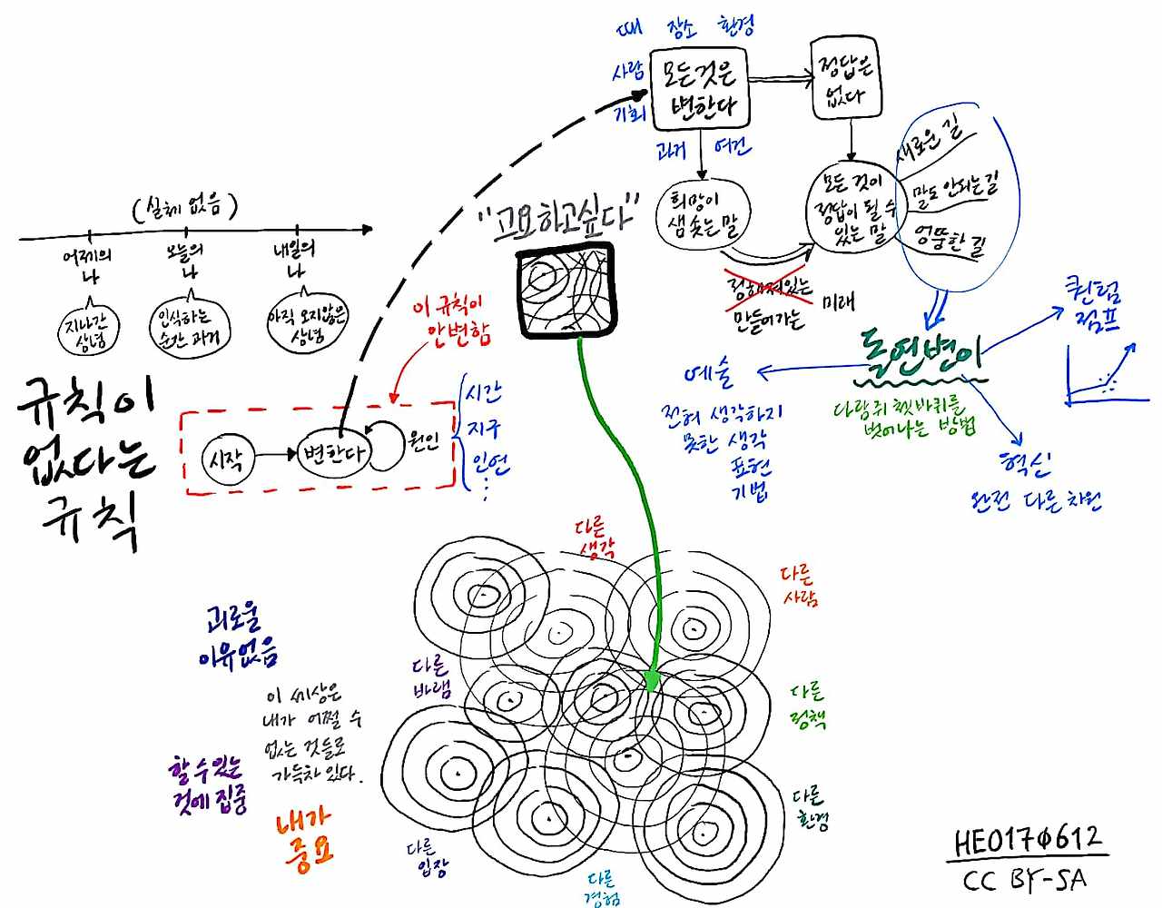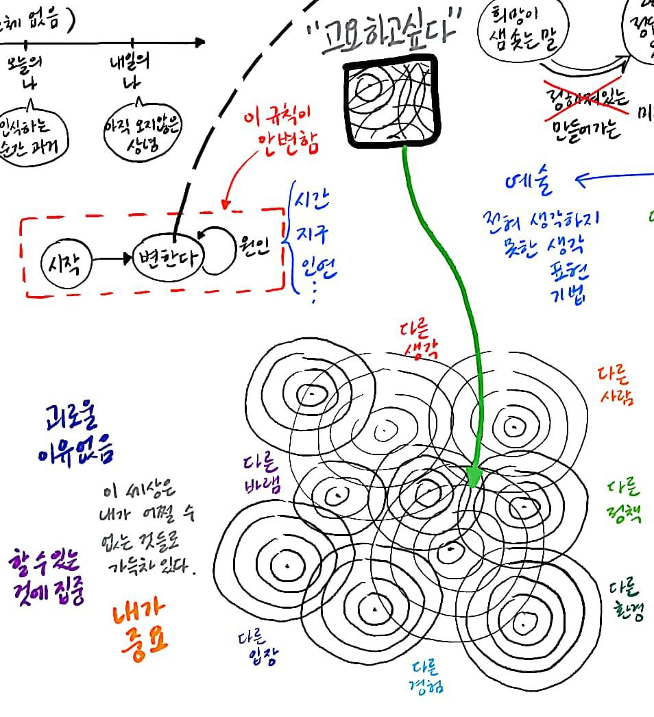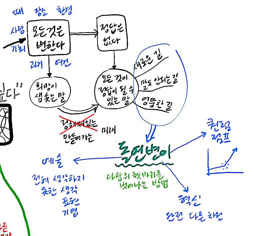 모든 것이 변한다는 것만큼 희망이 샘 솟는 말은 없다. 사랑하는 사람을 생각하면 서글픈 일이지만 절망에 빠질 일을 생각하면 이보다 더 크게 살려주는 말이 있을까 싶다. 모든 것은 변하고, 정답은 없다. 모든 것이 정답이 될 수 있다. 새로운 길, 말도 안되는 길, 엉뚱한 길도 정답이 될 수 있다. 정해져 있는 것은 없다.