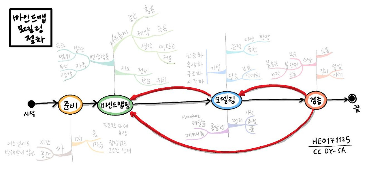 마인드맵모델링 절차는 매우 중요한 의미를 내포하고 있다. 각 과정의 활동보다 더 중요한 것은 사이클이다. 우리는 보통 한 번 그리고 말거나 한 번 생각하고 지나가 버리는 것들이 많다. 생각할 것이 너무 많은데 전에 생각했던 것을 또 생각하는 것은 낭비라고 생각한다. 영화도 그렇다. 한 번 본 영화보다 새로운 영화를 보고싶어한다. 하지만 다시 영화를 볼 때 못보던 것을 발견한 경험이 있는가? 지나쳐갔던 장면과 배경음악, 주변의 조연, 엑스트라의 움직임, 그리고 배우들의 진면목까지 보인다. 다른 시각으로 바라볼 수 있기 때문이리라. 이처럼 다시 돌아보는 시간은 우리에게 다른 시각으로 바라볼 수 있는 기회를 준다. 생각하는 것도 똑같다.