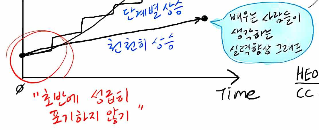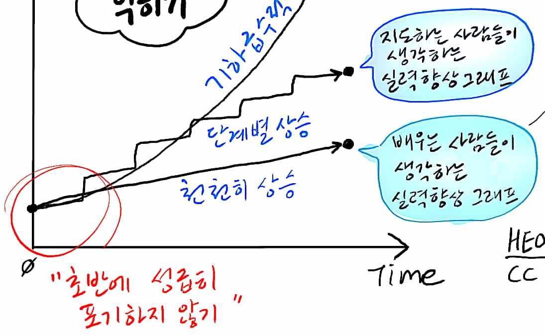 지도하는 사람들이 생각하는 그래프는 다르다. 한 단계를 거치면 다음 단계를 가르친다. 한 단원를 마치면 다음 단원으로 넘어간다. 한 학년을 마치면 다음 학년으로 진급한다. 그 전의 단계는 학습을 통해 배웠다고 간주한다. 그러니 그렇지 못한 학생은 따라가기 어렵다.