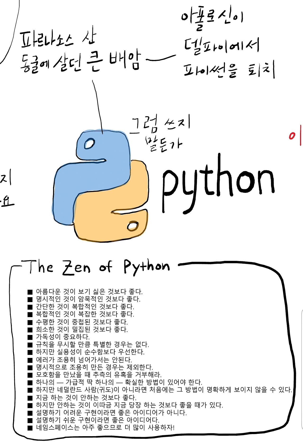 파이썬의 철학 The Zen of Python은 아래와 같이 치면 나옵니다. 물론 영어로.