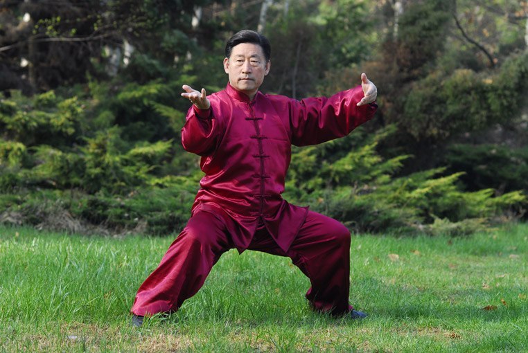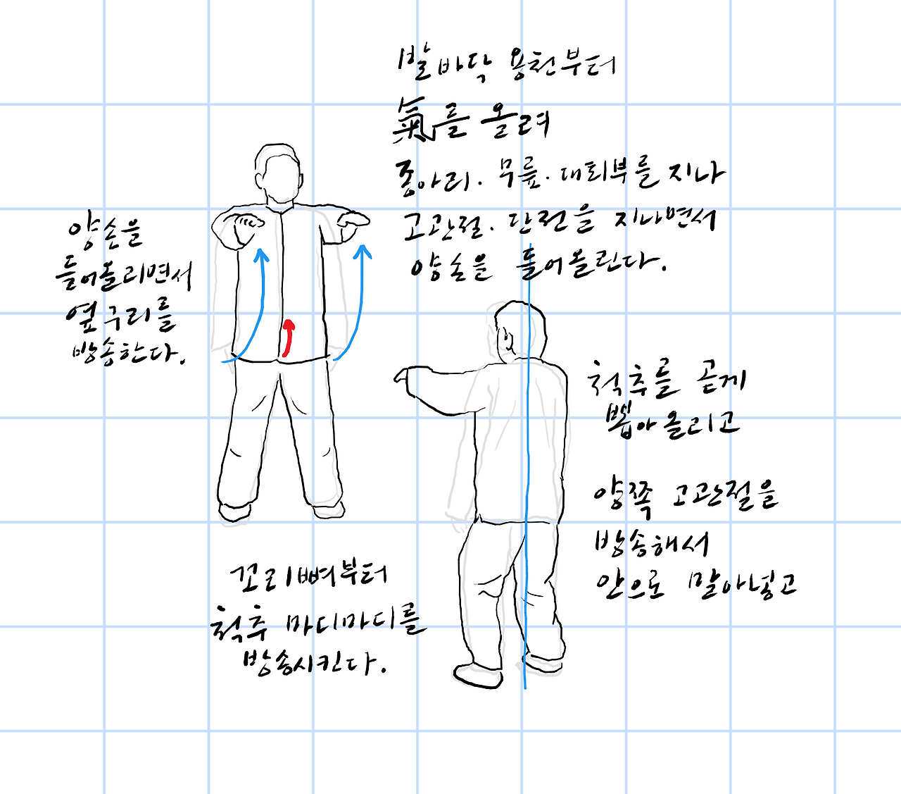 발바닥 용천부터 기를 올려 종아리, 무릎, 대퇴부를 지나 고관절, 단전을 지나면서 양손을 들어올린다.
