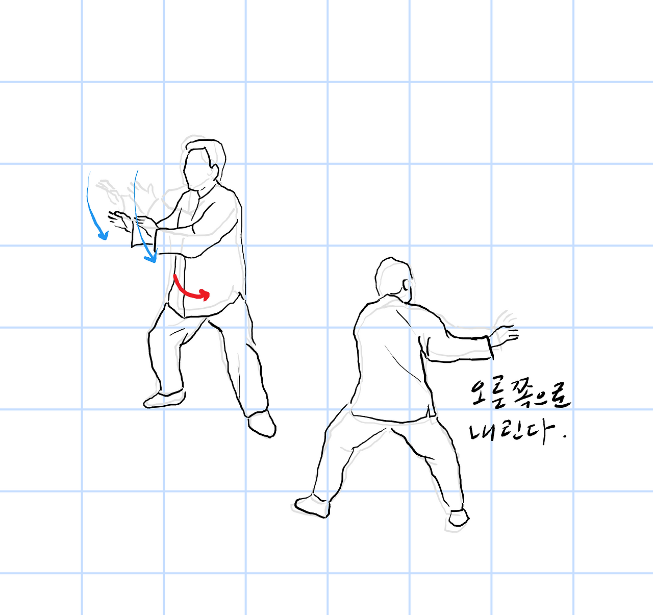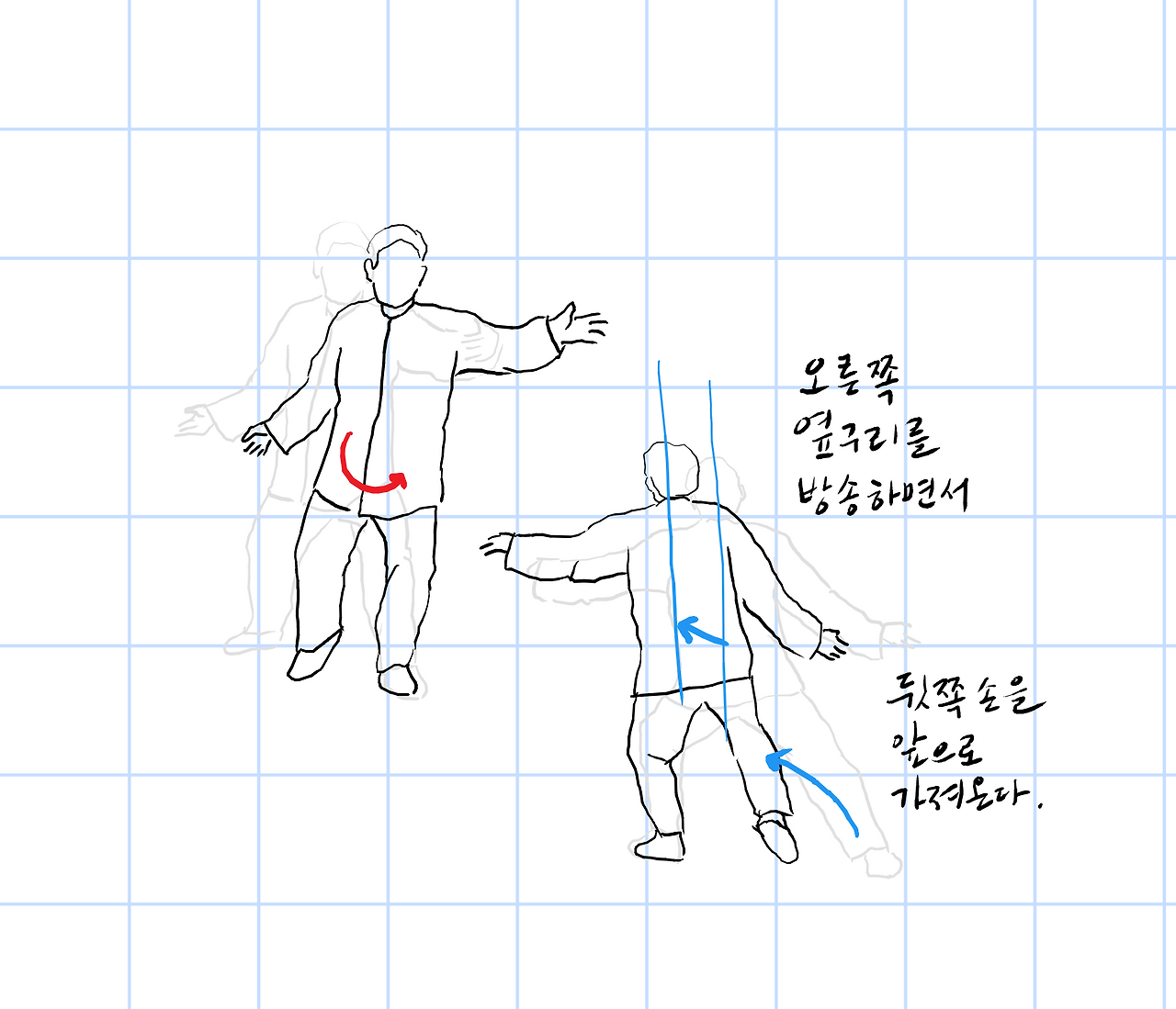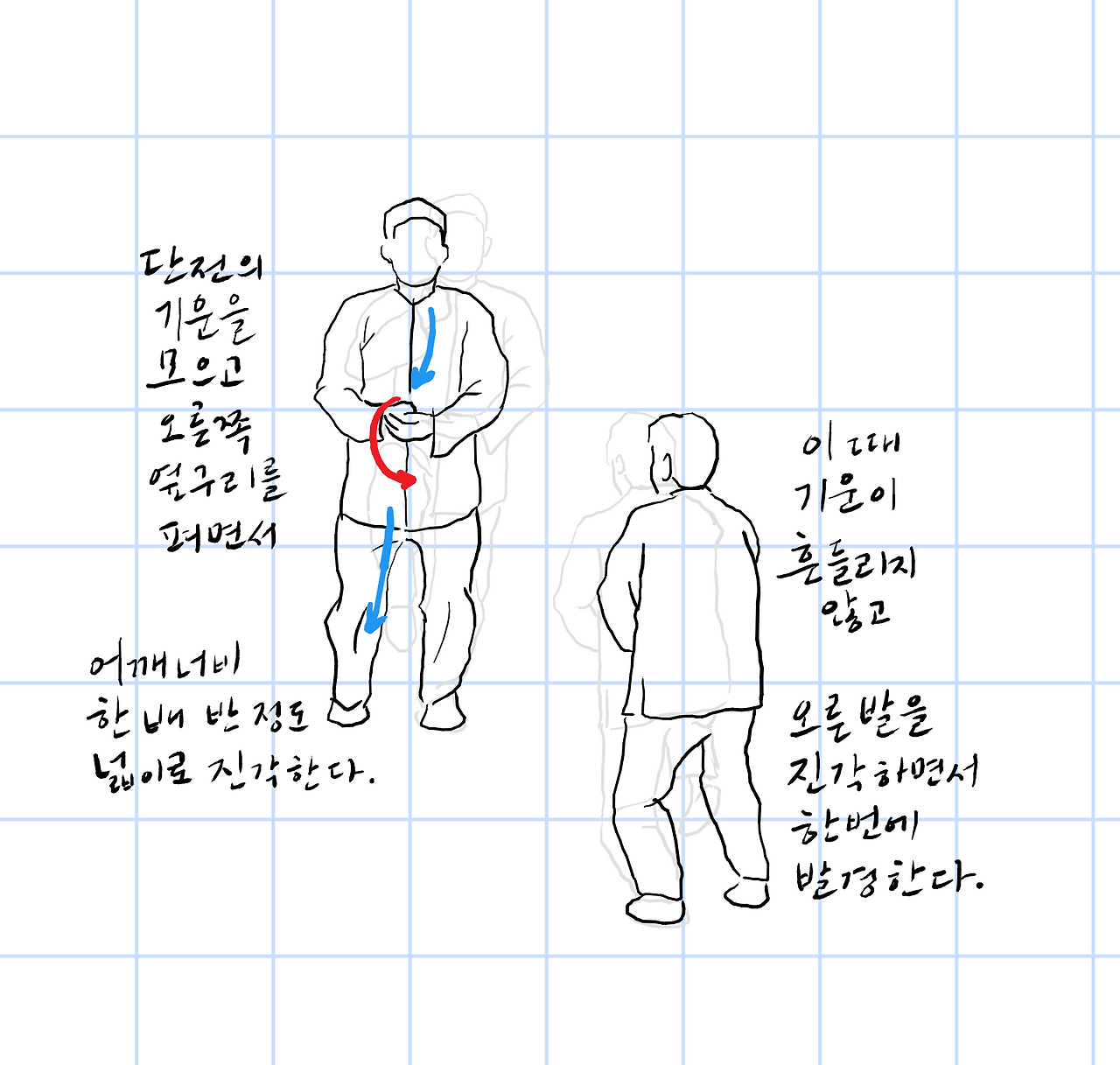 중심을 오른쪽으로 이동시키고, 오른쪽을 축으로 단전을 왼쪽으로 회전시킨다.