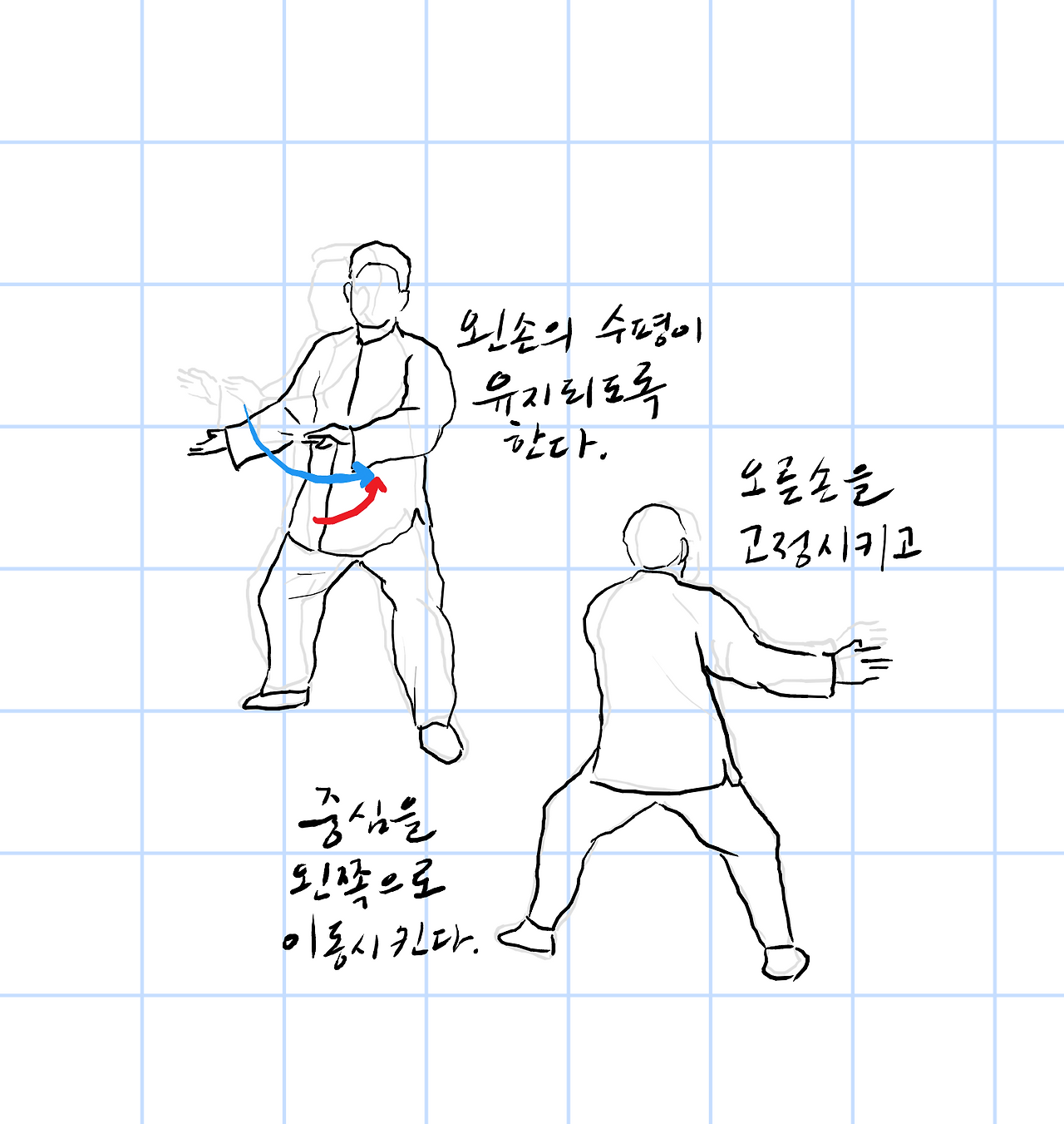 오른손을 고정시키고 중심을 왼쪽으로 이동한다.