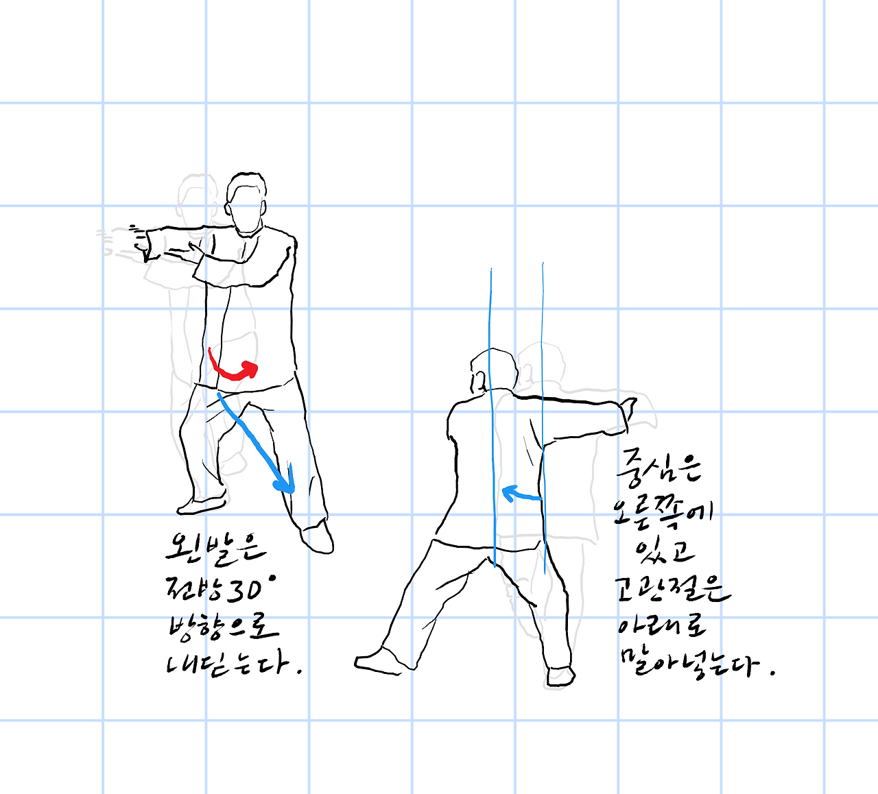 중심은 오른쪽에 있고, 고관절은 침이 되도록 한다.