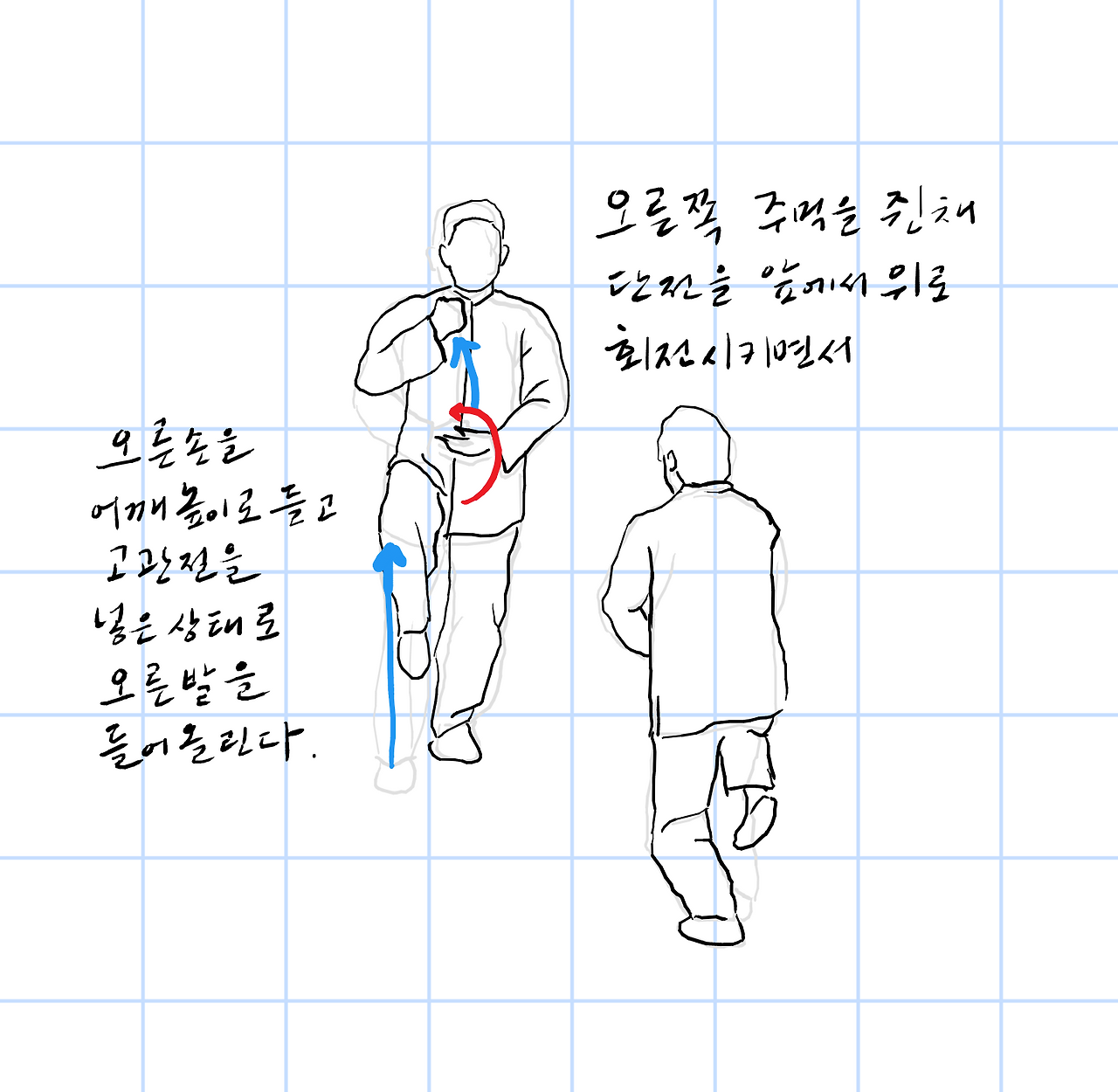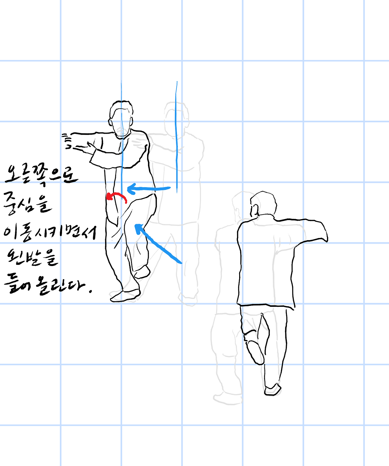오른손으로 어깨높이로 들고 고관절을 침하고 오른발을 들어올린다.