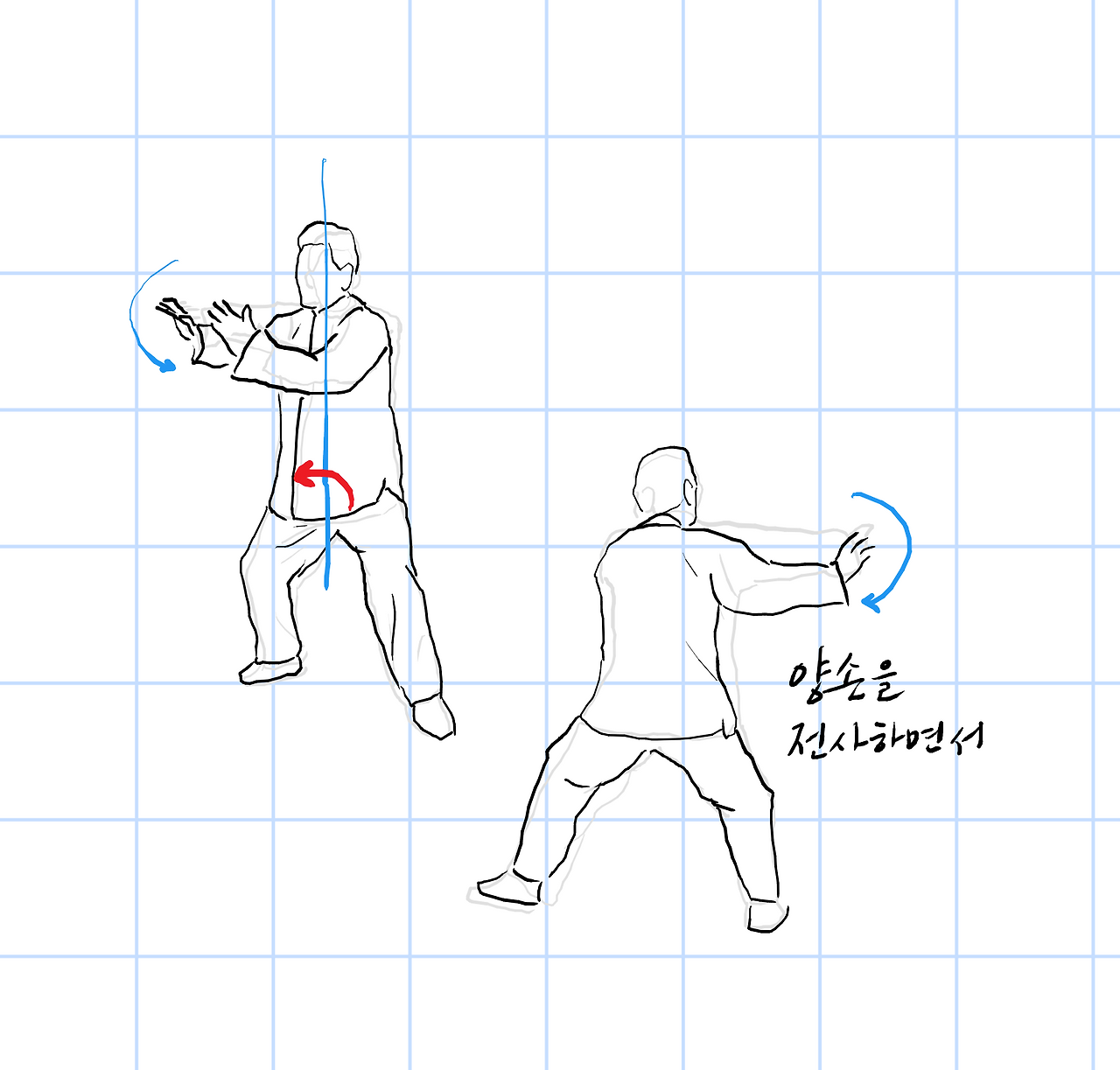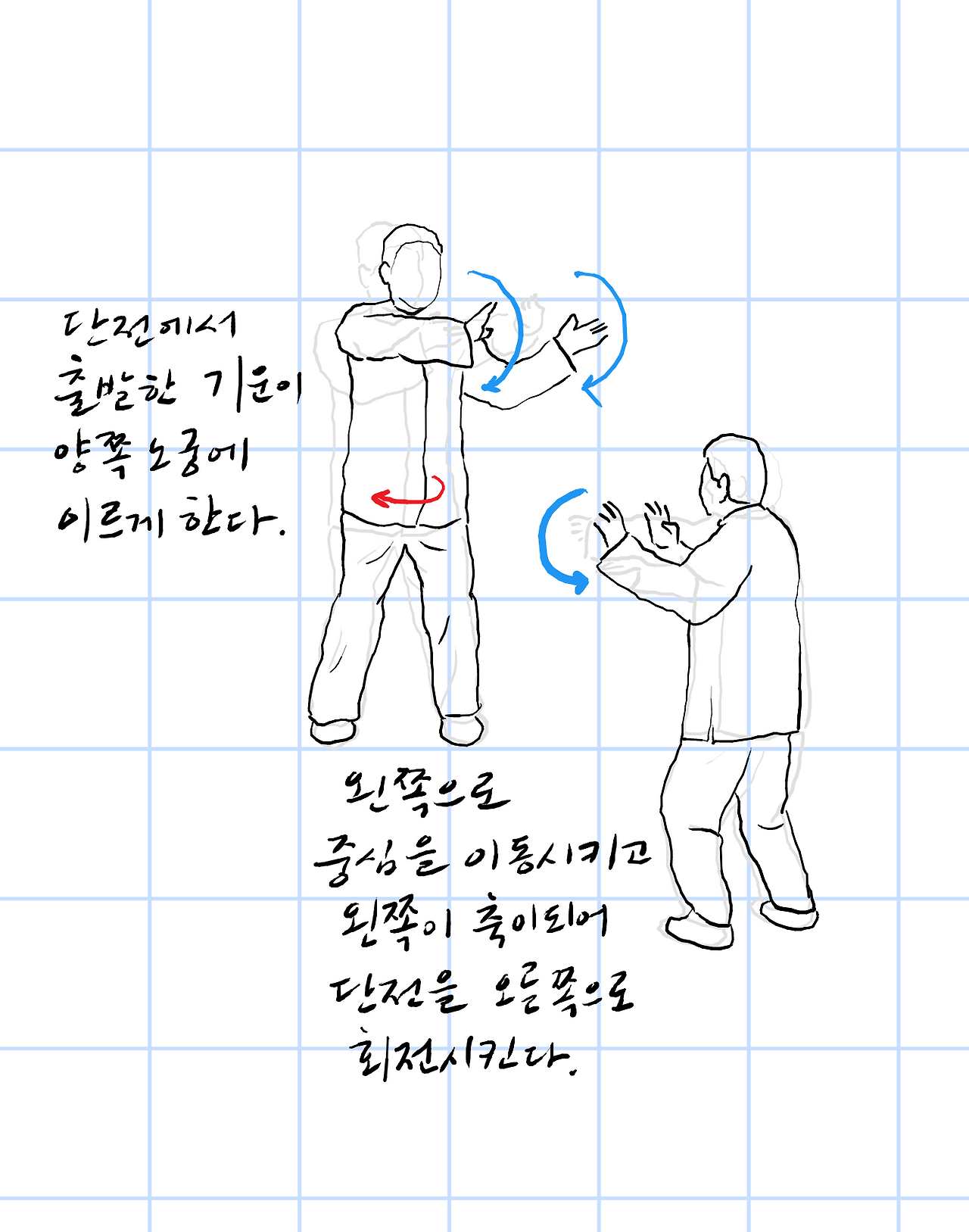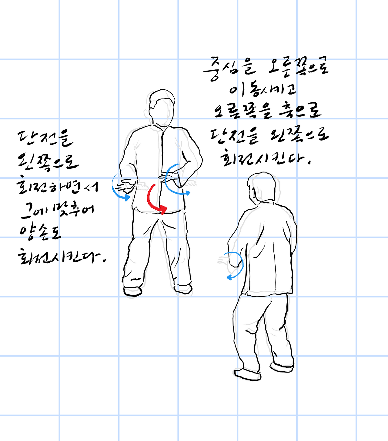 왼쪽으로 중심을 이동시키고, 왼쪽이 축이 되어 단전을 오른쪽으로 회전시킨다.