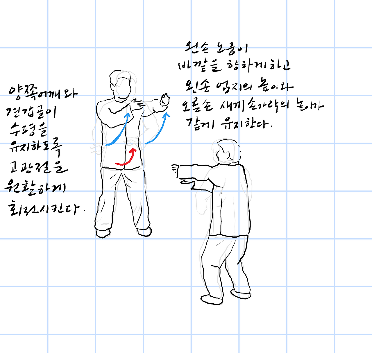 왼쪽 노궁이 바깥을 향하게 하고, 왼쪽 엄지의 높이와 오른손 새끼손가락의 높이가 같게 유지한다.