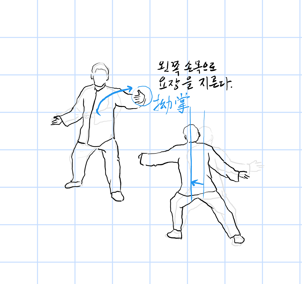 왼쪽 손목으로 요장(拗掌)을 지른다.