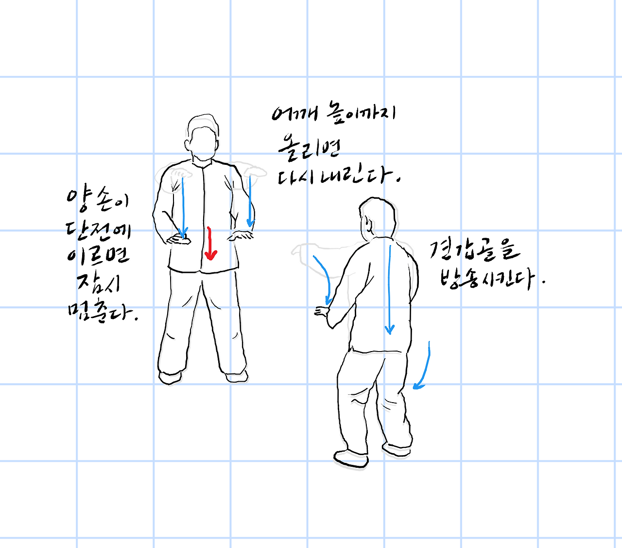 어깨높이까지 올리면 다시 내린다.