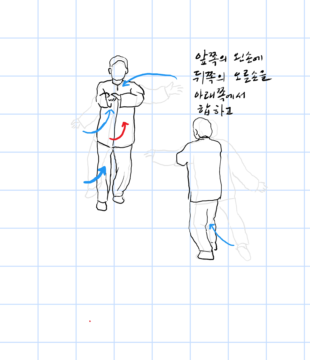 앞쪽의 왼손에 뒤쪽의 오른손을 아래쪽에서 합하고