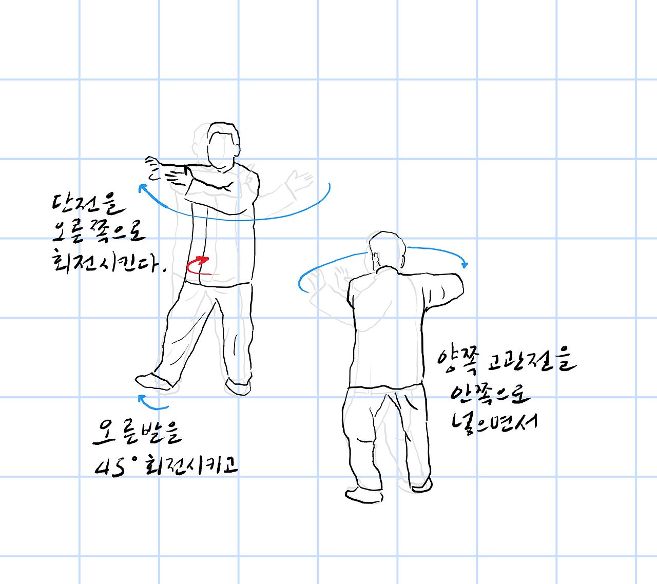 오른발을 45도 회전시키고,