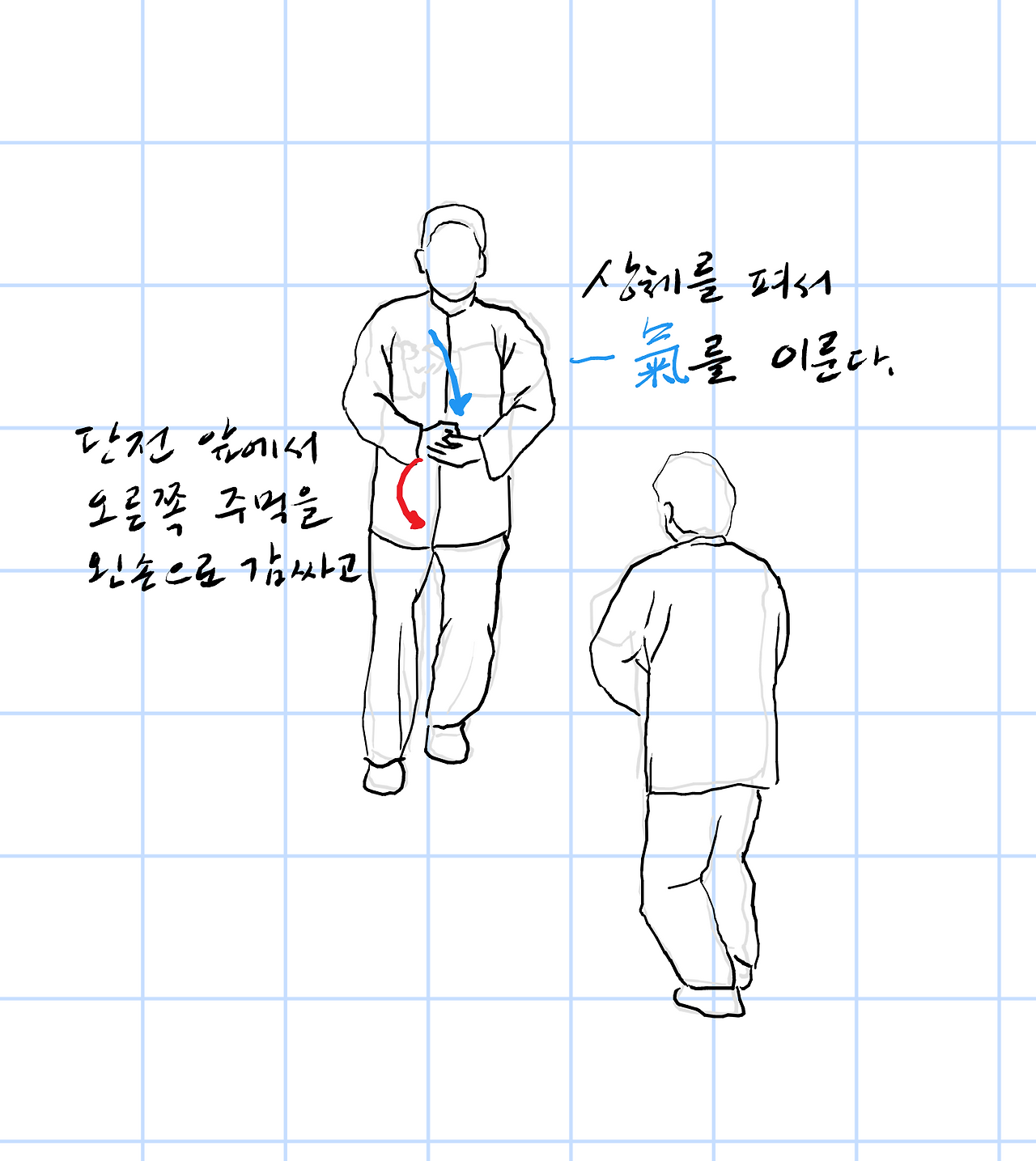 단전 앞에서 오른쪽 주먹을 왼손으로 감싸고