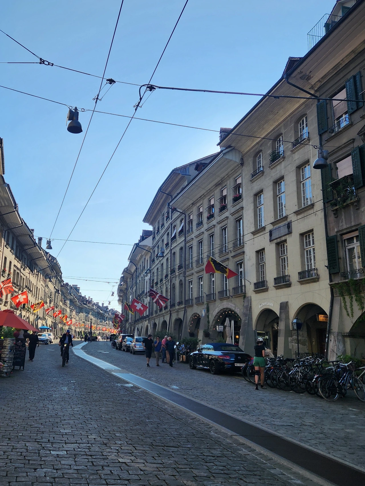 베른 구시가지는 큼지막한 스위스 국기와 연방기, 베른의 상징 곰 깃발이 도로 양쪽에 걸려 있었다. 중세시대의 돌바닥이 그대로 남아 있어 운치 있었다. 차선도, 횡단보도도 없는 돌바닥 위로 버스와 전차가 지나갔다.