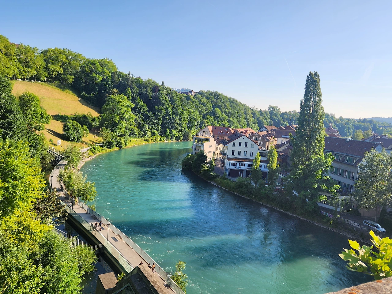 베른은 유네스코 세계문화유산으로 지정된 도시이기도 하다. 붉은 지붕의 고색창연한 집들과 천문시계탑이 중세로 걸어 들어가는 기분을 느끼게 했다. 아레강이 U자형으로 도시를 감싸고 흐른다. 위에서 내려다보니 사람들이 비취색 강물 위로 둥둥 떠서 내려오는 게 보였다. 워터파크보다 물살이 셀 뿐 아니라 인공이 아닌 자연이 선사한 놀이터였다. 그들이 가진 천혜의 자연환경이 부러웠다.