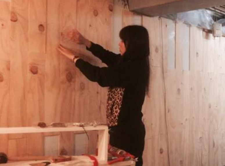 나무목재들을 구입해서 톱으로 자른 다음, 실리콘을 벽에다 쏴서 한쪽 벽을 다 채웠다.
