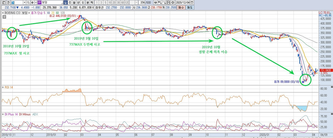 2019년 3월 중순 350$대로 매수한 보잉의 주가는 몇 달간 운항 재개 소식만을 기다리며 지지부진했고, 2019년 10월 737 MAX의 운항 재개 결정을 앞두고 결함 은폐 의혹이 대두되면서 2019년 12월 보잉은 737MAX 생산 중단을 발표하게 됐다.