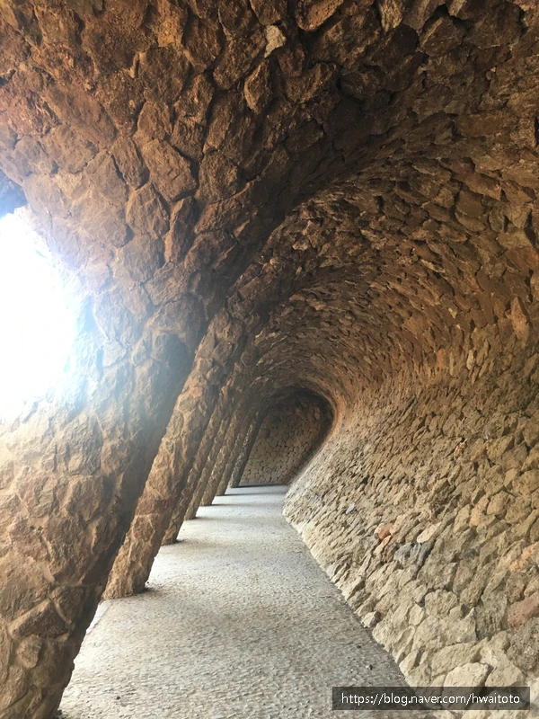 구엘공원의 광장을 받치는 기둥을 지나 아래로 내려오면 마치 파도가 치는 모양으로 사선으로 기울어진 긴 동굴 길이 있다. 2017년 바르셀로나 구엘 공원을 방문했을 때 화려한 도마뱀이나 광장 둘레 타일 등보단 난 이곳이 가장 마음에 들었다.