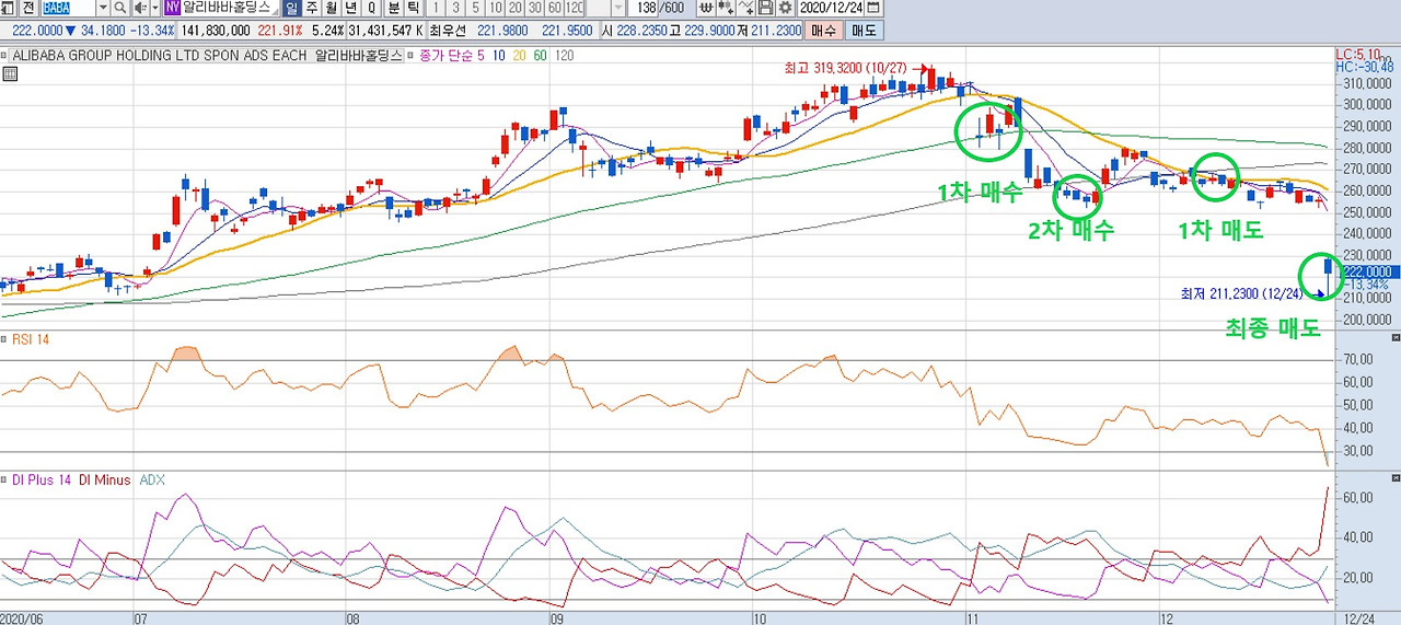 12월 9일 새로운 경기부양법안 지연 우려감으로 미국 주식 시장에 기다리던 조정이 왔고, 비중을 더 늘리고 싶었던 종목 매수를 위해 알리바바를 절반가량 매도했다.