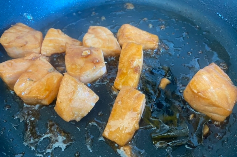 시간을 단축하기 위해 나는 사방 3~4cm 정도로 연어를 작은 큐브로 자른다. 그렇게 잘라 둔 연어를 먼저 기름을 두른 달궈진 팬 위에서 사방을 구워준다. 완전히 다 익힐 필요는 없다. 어차피 다시 조려 줄 거니까. 그렇게 연어를 익히고 기름기 있는 팬에 먼저 설탕을 한 스푼 넣고, 간장도 한 스푼 넣어 준다. 그런 후, 물을 조금 자작하게 부어준다. 마지막으로 다시마 한 조각을 넣어준다. 그렇게 서서히 조려주면서, 계속해서 연어 윗면에도 소스를 끼얹어주고 연어를 뒤집어주기도 하면서 고루 물들게 해 준다. 다 익은 연어에 다진 파를 뿌려준다. 간단한 연어 조림 완성이다.
