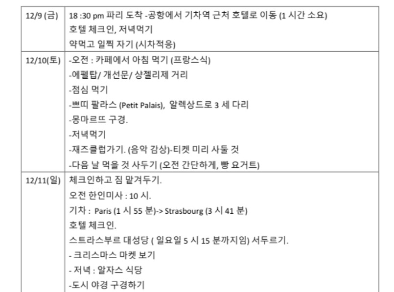 12월에 엄마가 이곳으로 오신다. 엄마를 위해 계획을 문서로 작성했다. 언니에게 한번 검사를 받고자 공유했더니 언니가 "너는 진짜 계획형 인간이구나"라고 놀랍다고 했다. 이렇게 하지 않는 사람들이 있다는 게 나는 더 신기하지만, 그런 다름을 인정하는 것도 사람과의 만남에서 즐거운 요소이기도하다. 엄마를 위한 계획을 세우고 나니 맘이 한결 편해졌다. 이제 이걸 지키기만 하면 된다. 얼른 12월이 오면 좋겠다.