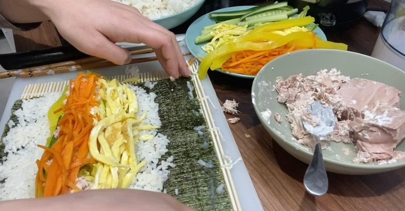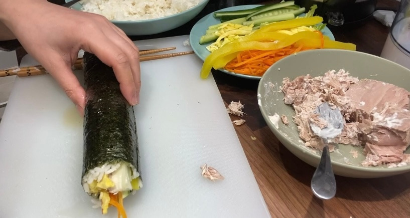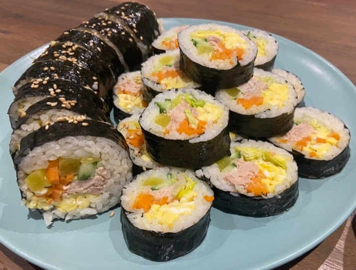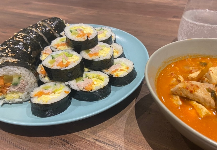 참치김밥이 먹고 싶었던 어느 날, 퇴근길에 아시아 마켓에서 참치캔과 단무지를 사 온다. 퇴근하고 바로 밥도 새로 하고, 밥이 되는 동안 김밥 재료들을 준비한다. 계란도 부치고, 오이도 준비하고 (참치김밥에는 오이가 어울린다는 게 개인적 생각) 당근도 볶아둔다. 마요네즈 듬뿍 뿌려 참치와 비벼준다. 냉장고에 있는 상추 비슷한 것이 눈에 띈다. 어쩐지 김밥에 넣으면 샐러드김밥처럼 잘 어울릴 것 같아서 함께 준비해본다. 밥에 참기름과 소금을 넉넉히 넣어 간을 하고 깨소금도 뿌려줘서 고소함을 추가한다. 김에 밥을 얹고 고루 펴준다. 준비된 속 재료들을 넣고 돌돌 말아준다. 일정하게 썰어주니 맛 좋고 예쁜 참치김밥 완성이다. 전날 먹고 남아있던 김치찌개와 곁들여 먹어본다. 김밥을 많이 만들어서 배불러서 다 먹지 못하고 남아버렸다. 아쉬웠다. 남은 김밥을 보관해둔다.