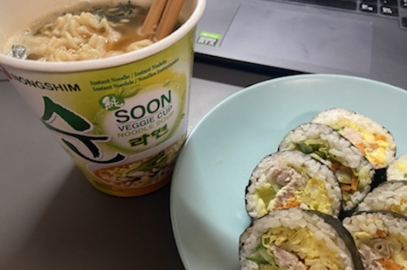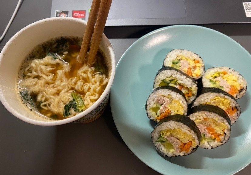 김밥 싸기가 간단한 것처럼 참치김밥도 참치만 추가하면 되니 어려울 것은 없다. 다만 이 나라에서 아쉬움이라면 깻잎이 없다는 거다. 깻잎이 없어 아쉽지만, 더 좋은 참치김밥의 짝꿍을 곁들였다. 바로 컵라면이다. 분식은 아무래도 가볍게 먹는 느낌의 음식이다 보니, 어쩐지 끓인 봉지라면보다는 컵라면이 김밥에 더 어울리는 느낌이다. (나만 그런가?) 이곳에서 처음 보는 비건 라면을 발견했는데 이름이 "순라면"이다. 맛이 제법 괜찮아서 종종 사 먹곤 한다.