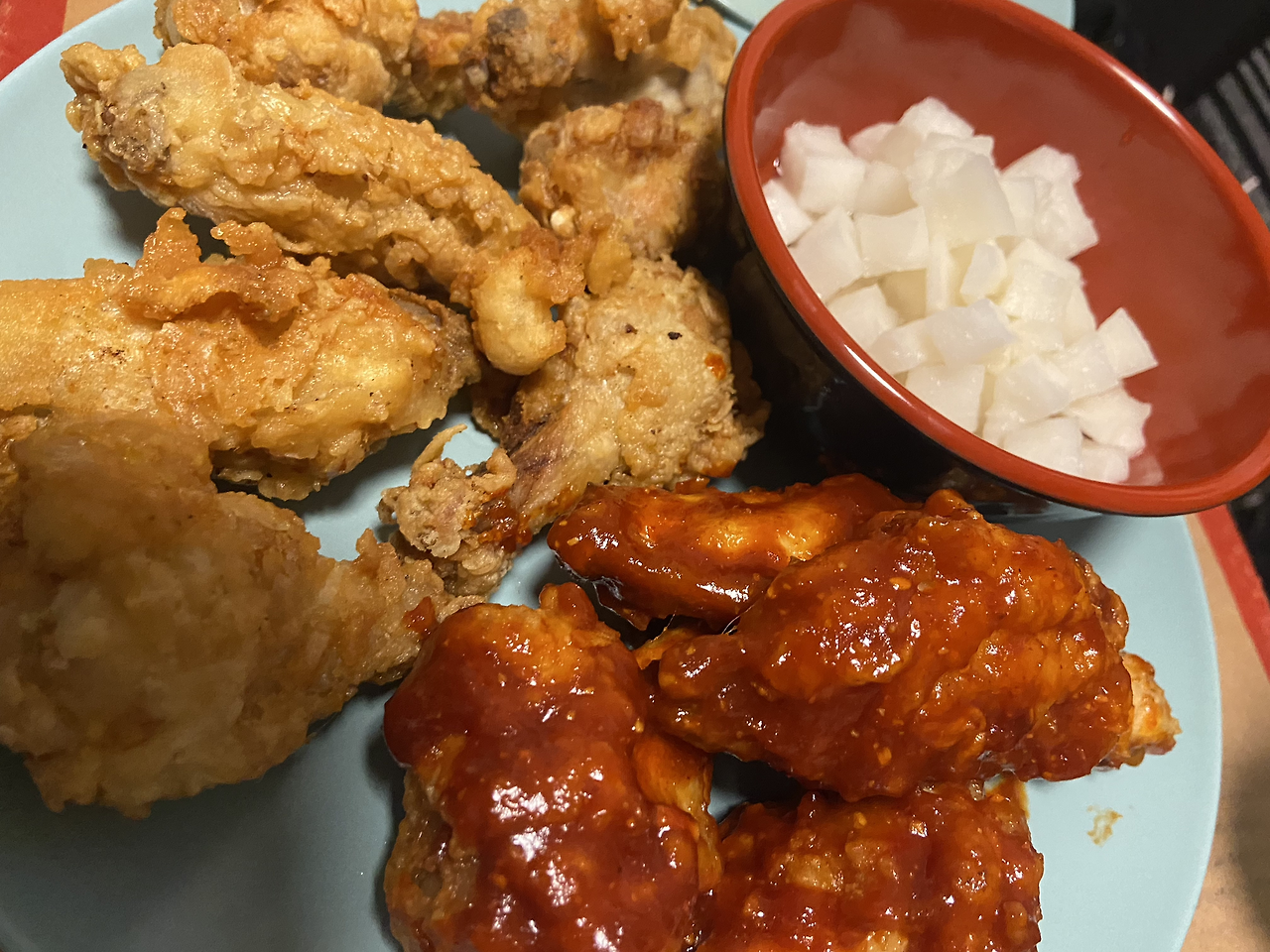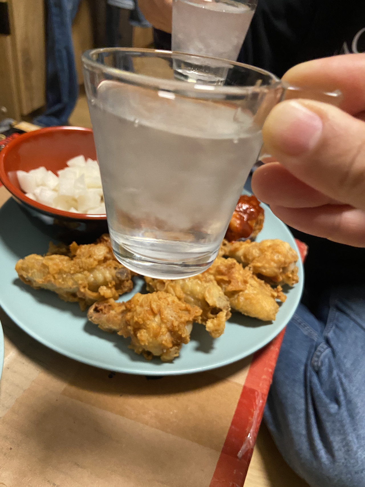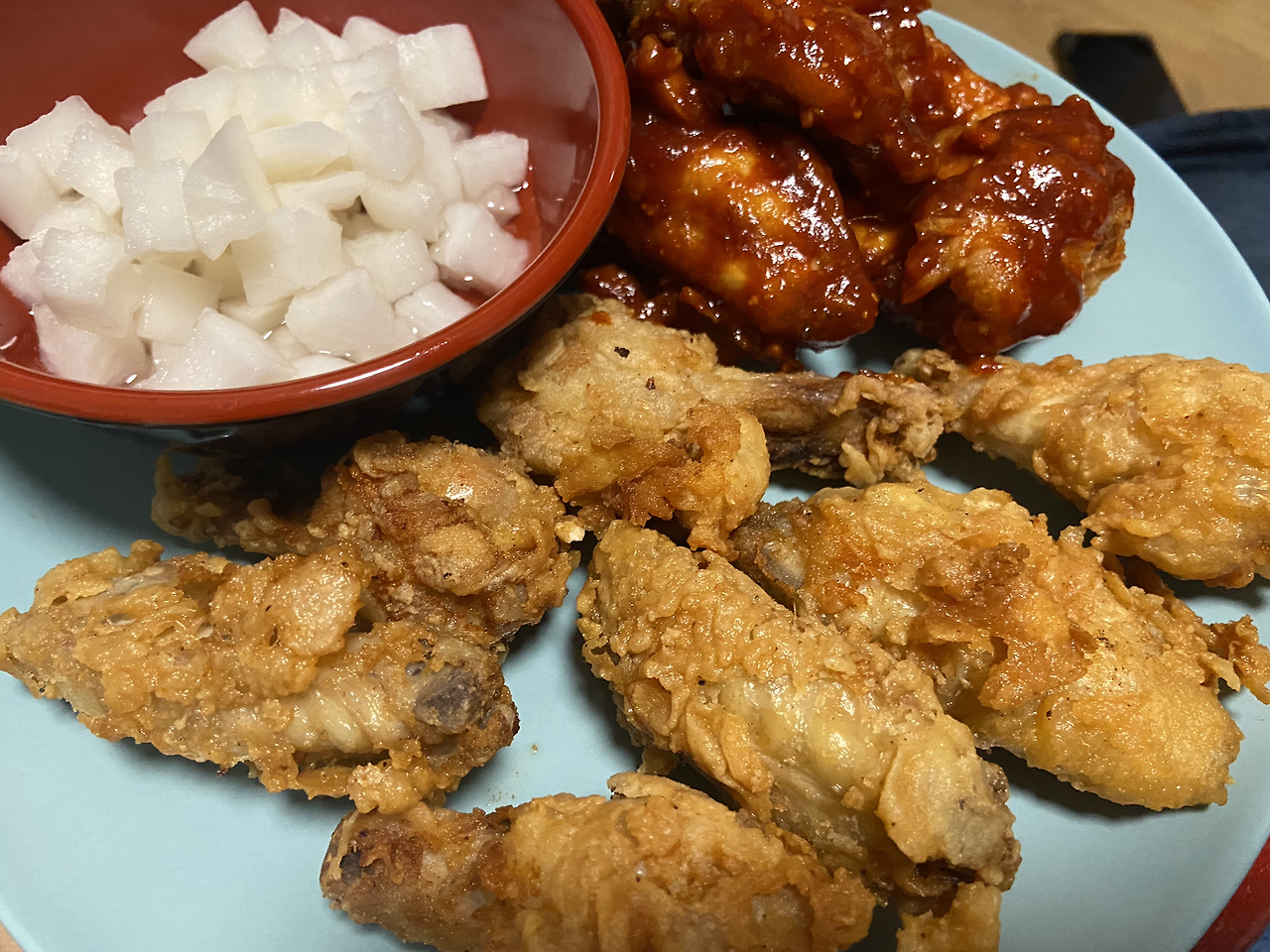 접시에 담아본다. 후라이드 반, 양념 반, 그리고 무 많이. 한국인 친구가 소주를 가져왔다. 냉동실에 넣어 슬러시로 만들어진 소주를 에스프레소 잔에 따라 마셔본다. 윽. 소주는 역시 쓰다. 바로 소맥으로 갈아타서, 소주와 맥주를 섞은 후 마셔본다. 달다. 치킨을 한입 베어 문다. 바삭한 소리가 방 안 가득 찬다. 성공이다. 배달이 안되면 어떠하리. 이곳에 맛있는 치킨이 안 판다면 어떠하리. 내가 직접 튀기면 되는 것을.