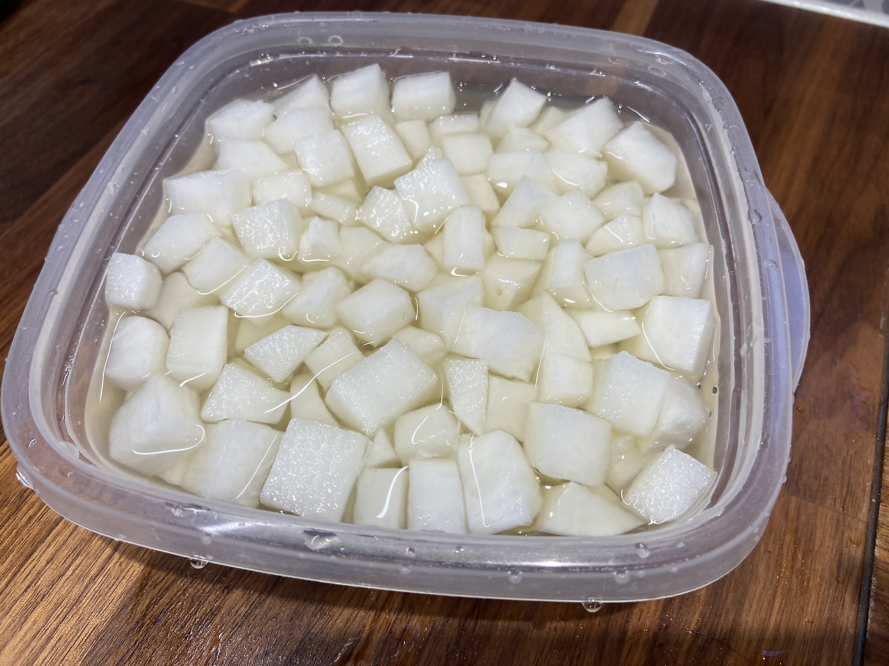 어제저녁은 스페인과 독일전이 예정되어 있기에 집에 다른 한국인 친구가 놀러 오기로 했다. 내가 간단하게 치킨 너겟으로 양념치킨을 해주겠다 했더니, 제대로 치킨을 하면 안 되냐고 했다. 안될게 뭐 있겠냐 싶어 그럼 진짜 후라이드 치킨을 준비한다고 했다. 한국 치킨이 우리의 목표기 때문에 금요일에 미리 무를 사다가 치킨무를 만들어뒀다. 치킨무는 간단하다. 식초, 설탕, 물, 무만 있으면 된다. 먼저 식초, 설탕, 물을 1:1:1로 섞어준 후, 깍둑썰기로 준비한 무를 넣어준다. 바로 이틀 후 먹을 거기에 실온에 보관해 준다. 다음날 무에서 물이 나오면서 너무 묽어졌다. 안에 있던 물들을 그냥 다 버리고, 식초:설탕=1:1 비율로 다시 넣어준다. 경기가 있는 일요일 당일 오전에 치킨무를 맛 보니 뚜껑을 여는 순간부터 바로 치킨무였다.