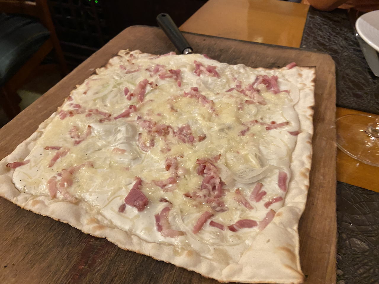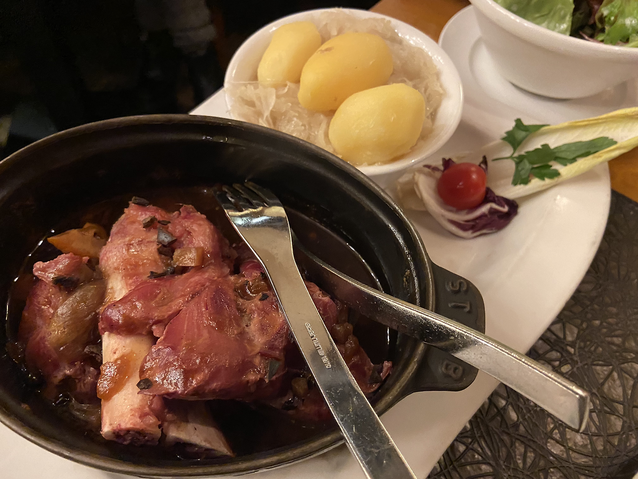 크리스마스 마켓을 본 곳을 또 보고, 시간을 보내다가 예약보다 조금 일찍 식당에 들어갔다. 다행히 바로 테이블에 앉을 수 있었다. 메뉴를 보고는 내가 시키고 싶은 대로 시킨다. 이곳 알자스 지역의 요리를 전문으로 하는 인기 많은 식당을 예약해 두었었다. 조금은 양이 많을 수도 있지만, 엄마가 맛봤으면 좋겠다 싶은 메뉴들로 요리를 시키고, 식전 주도시켜서 엄마와 샴페인을 맛봤다. 엄마가 여행 전에 여행경비를 어느 정도 보내주셔서, 여유가 있다고 생각했다. 샴페인을 마시고, 따뜻한 식당의 온기에 엄마는 금방 몸이 녹아 컨디션을 회복하셨다. 먼저 이 지방 요리 중 내가 제일 잘 먹는 딱뜨플렁베다. 다 못 드실걸 알았기에, 절반 사이즈로 주문했다. 엄마는 조금 탄 부분이 있으니 탔다고 안 드셔서 나와 서로 바꿔먹었다. 탔다의 기준이 엄마는 조금만 까매도 안 드셨고, 이곳에 일 년 가까이 있으면서 나는 탄 요리에 조금 관대해졌다. 엄마가 딱뜨플렁베를 그래도 잘 드셔서 좋았다. 그다음 돼지 목 요리와 알자스 고기 스튜가 나왔다. 돼지 목 요리에는 감자와 사워크라우트가 곁들여 나왔는데, 엄마가 이 날 테이블에서 가장 잘 드신 것은 힘 빠지게도 사워 크라우트였다. 사워크라우트는 독일의 발효 양배추 절임이다. 엄마가 예전에 독일로 출장을 종종 가셨었기에 드셔 보았던 경험도 있고, 아무래도 발효된 양배추다 보니, 김치를 먹는 한국인에게 친숙할 수밖에 없는 맛이지 않나 싶다.