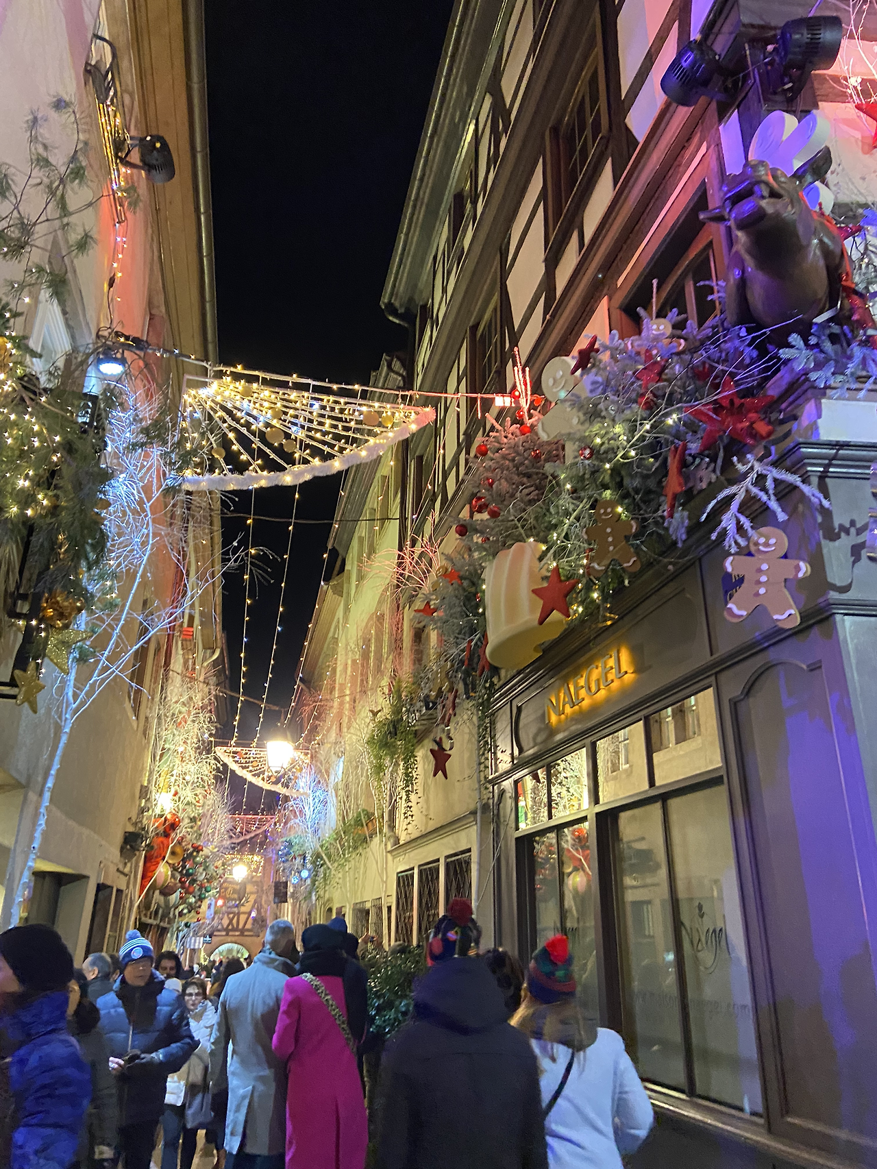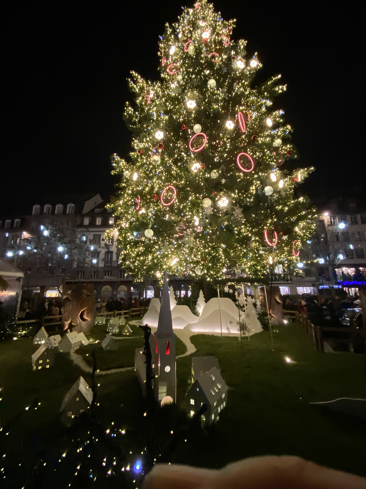성당을 예상보다 일찍 보고 나오고 보니 예약해둔 식당에 가기까지 거의 한 시간 반이 남아 있었다. 크리스마스 마켓을 구경하면서 시간을 보내면 되겠다 생각했는데, 추위를 고려하지 않은 나의 잘못된 선택이었던 것 같다. 먼저 성당 앞 마켓을 둘러보았다. 뱅쇼를 하나 사서 엄마와 나눠마시는데, 하필이면 맛없는 뱅쇼를 샀다. 엄마가 잘 드시지 않았다. 그런 뱅쇼를 내가 거의 다 마셔야 했고, 마켓 여기저기를 둘러보기 시작했다. 마켓을 다 보고도 시간이 남아서, 광장에 있는 크리스마스트리를 보여드릴 겸 모시고 갔다. 스트라스부르의 트리는 유럽에서 가장 큰 생화 트리이다. 커다란 크리스마스트리와 그 아래 장식품까지 엄마는 모두 사진 속에 담고 싶어 하셨다. 꽃꽂이를 하시는 분이라, 이런 모든 걸 아이디어라고 보시는 것 같았다. 아무 생각 없이 그저 예쁘다고 감상하고 마는 나와는 달랐다. 이렇게도 만들 수 있구나 하면서 하나하나 세세하게 관찰하셨다. 식당 예약까지 한 시간이 남아서 계속 걸으며 도시 곳곳의 크리스마스 장식들을 보았다. 이렇게 온 도시가 장식된 곳은 세계에서도 흔하지 않을 것이다. 엄마는 완전히 새로운 세계라고 하셨다. 한국과는 완전히 다르다며, 이런 것이 있는 줄도 몰랐다고 하셨다.