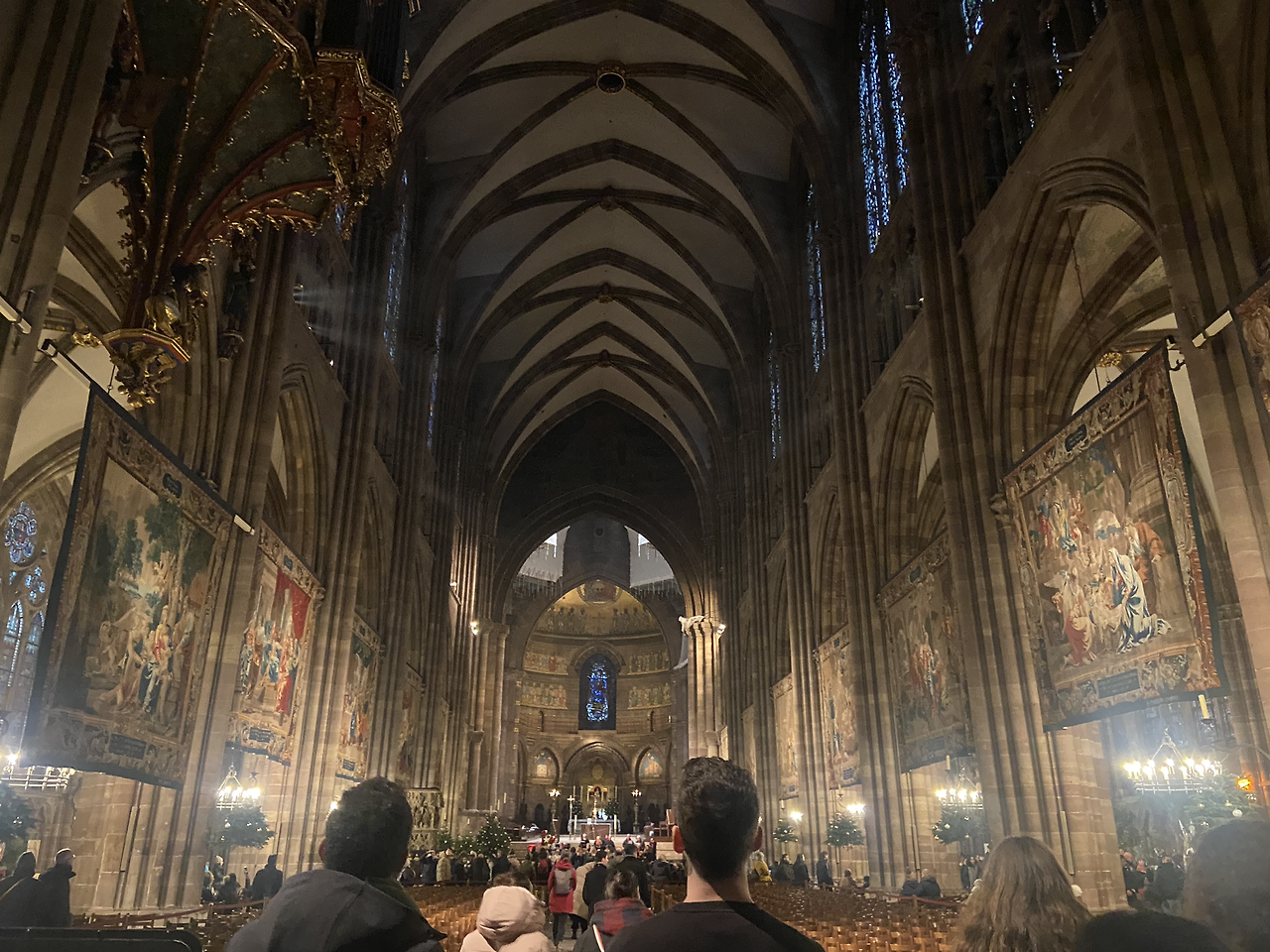 파리에서 출발한 기차는 한 시간 반 만에 스트라스부르에 도착했다. 스트라스부르의 크리스마스 마켓은 온 유럽에 유명한 이 도시의 빅 이벤트이다. 연중 가장 많은 관광객들로 이 도시가 시끌벅적해지는 기간이었다. 많은 사람들이 기차에서 내렸다. 엄마에게 대성당을 보여드리려고 했기에 서둘러 호텔에 가서 체크인을 하고 짐을 방에 놔뒀다. 일요일 저녁은 5시 15분까지 호텔 입장이 가능하다고 들었기에 서둘러 엄마를 모시고 대성당으로 향했다. 대성당의 웅장함에 엄마가 감탄하셨다. 화재로 인해 파리의 노트르담 성당을 볼 수 없었기에 엄마를 위해 스트라스부르의 대성당을 보여드리고 싶었다. 많은 사람들은 크리스마스 마켓만을 위해 이곳을 찾지만, 나는 대성당이 없었다면 엄마를 모시고 오진 않았을 것이다. 엄마는 성당에서 신나는 듯이 이곳 저것 구경하시며 사진을 찍었다. 성당 안에서는 크리스마스 캐럴들을 성가대가 부르고 있었다. 평소보다는 관광객들 때문인지 성당 내부에서 많은 곳이 통제로 막혀있었고, 지붕 쪽도 보수공사 중이라 조금 아쉬움이 있었다. 스트라스부르 대성당의 자랑인 천문시계도 통제되고 있었다. 아쉬웠다.