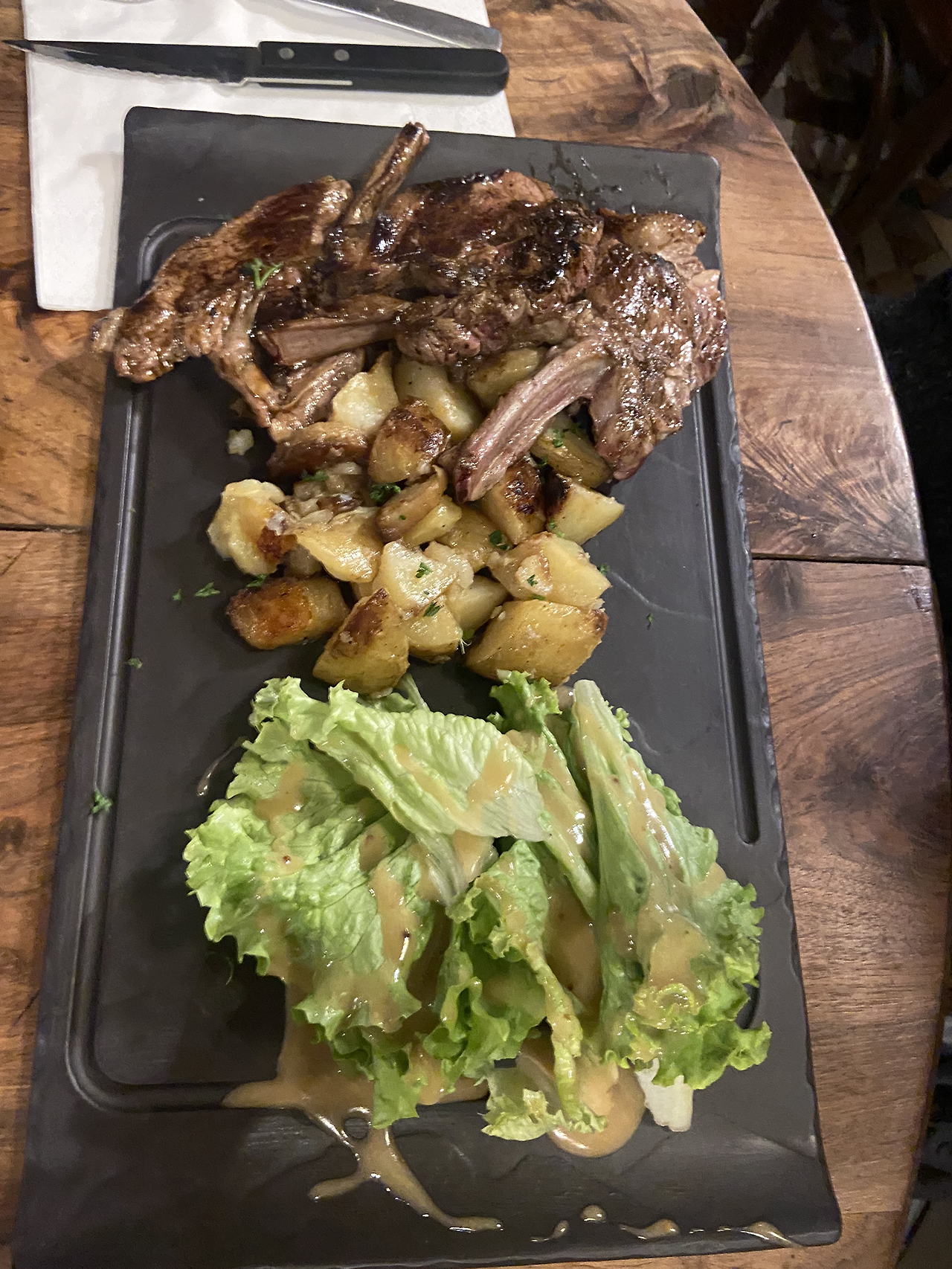 이 날 저녁은, 화덕에 구워주는 스테이크 집이었다. 엄마가 예전에 프랑스에 와서 양고기를 맛있게 드셨다고 몇 번이나 얘기하셔서, 소고기가 대표되는 식당이지만 엄마에게 양고기를 시켜드리고 난 소고기를 시켰다. 주방은 두 명이 요리하는데 아주 효율적으로 움직이고 있었다. 와인도 시켰다. 이 날은 엄마가 가장 잘 드신 날이었다. 양고기가 크게 네 덩이나 나왔지만 모두 잘 드셨다. 곁들여진 사이드도 잘 드셨고, 와인도 곧잘 드셨다. 뿌듯했다. 생각해보니, 가장 많은 활동을 한 날이었고, 엄마가 세 끼 모두 가장 잘 드신 날이었다. 좀 더 여러 활동들로 다채롭게 채웠다면 엄마가 더 잘 즐기셨을 텐데 하는 아쉬움이 들었다.