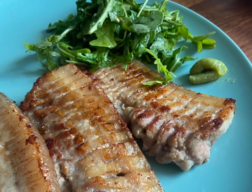 마켓에서 500g의 커다란 덩어리 통 삼겹살을 사 와서는 적당한 두께로 썰어내 본다. 조금은 특별하게 해 보고자 삼겹살에 양쪽으로 칼집을 내 본다. 전문가처럼 제대로 내는 것이 쉽지 않지만 그저 기분만 내본다. 그런 후, 프라이팬에 삼겹살을 노릇하게 구워준다. 이 날은 마땅한 채소가 없어 진정한 한국인의 삼겹살 한 상을 차려내진 못했다. 가위로 잘라먹어야 제대로인데, 따로 불판도 없고 고기 자를 큰 가위도 없다. 어쩔 수 없지, 삼겹살 스테이크처럼 칼질을 하며 삼겹살을 먹는다. 이 날은 쌈장이 아닌 고추냉이를 곁들였다. 쌈장의 감칠맛도 좋지만 고추냉이의 개운함도 기름진 삼겹살과 참 잘 어울린다. 많은 이들이 이미 알고 있는 환상 조합이지만 혹시나 모르는 분이 있다면 꼭 시도해보길 추천한다.