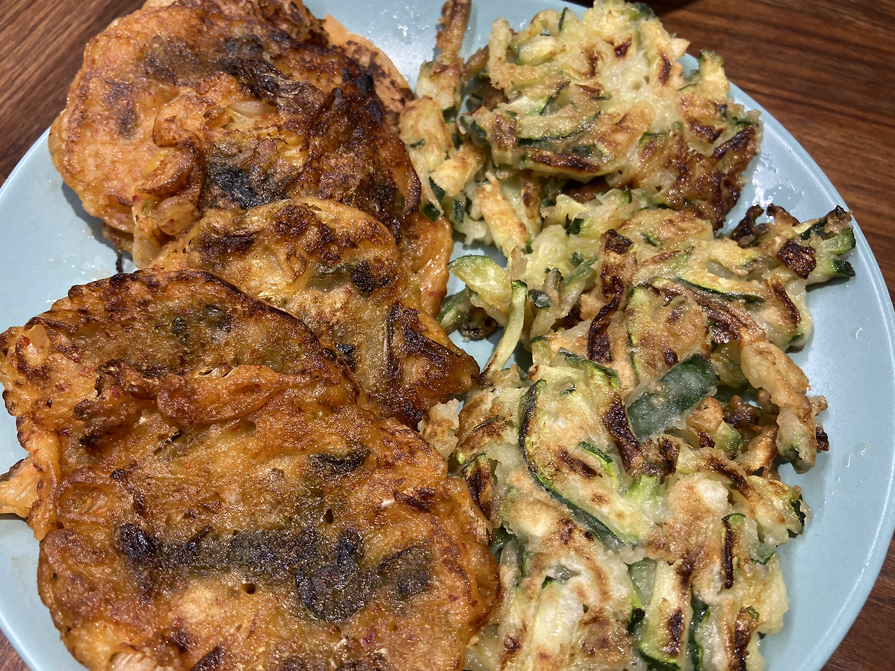 순두부에 고기등을 넣지 않았기 때문에 비건메뉴라 생각했다. 그런데 생각해 보니 코인육수 재료가 뭔지 몰라서 비건이라고 확신할 수가 없다. 아쉽다. 그래도 채식메뉴로 가보자는 생각으로, 된장찌개에 넣고 남은 쥬키니를 채 썰고 소금에 살짝 절인 후, 거기서 나온 수분을 이용해서 부침가루를 넣어 섞은 후 기름 두른 팬에 바삭하게 구워내서 호박전을 완성했다. 반죽물을 하나 만들고 김치를 섞은 후, 그대로 김치전도 만들었다. 둘 다 맛을 보니 간편하지만 맛이 좋았다.