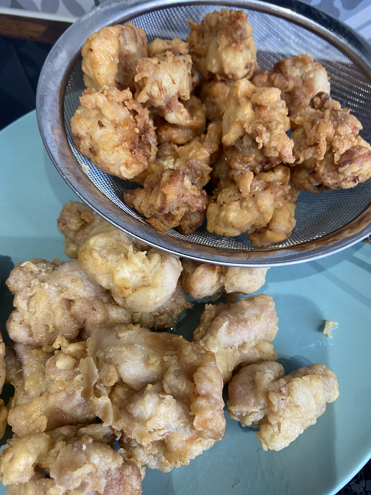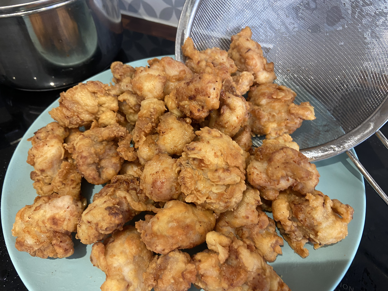 저온에서 속까지 익게 튀겨낸 닭을 이제 바삭하게 고온에서 튀길 차례이다. 170도씨 정도의 온도에 (그냥 감으로 온도를 높여 준비한다) 한번 튀겨낸 치킨을 넣고 서둘러 튀긴다. 색이 먹음직스러운 골든빛을 내면 완성이다. 꺼낸 후 튀김옷을 만져보면 바삭한 느낌이 난다. 시간이 촉박하니 서둘러 치킨을 마저 튀겨내 준다.