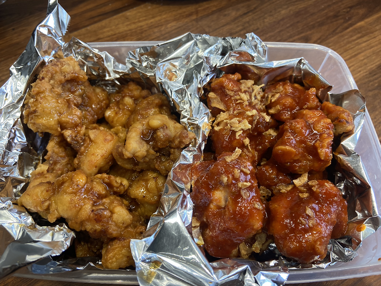 모두 튀긴 치킨은 반은 간장소스에 절반은 양념소스에 버무려준다. 담아갈 통을 준비해서 알루미늄 포일로 반반 칸을 나눈 뒤 버무려둔 치킨을 담는다. 서둘러 뚜껑을 닫고 집에 있던 와인 한 병도 챙겨 집을 나선다.