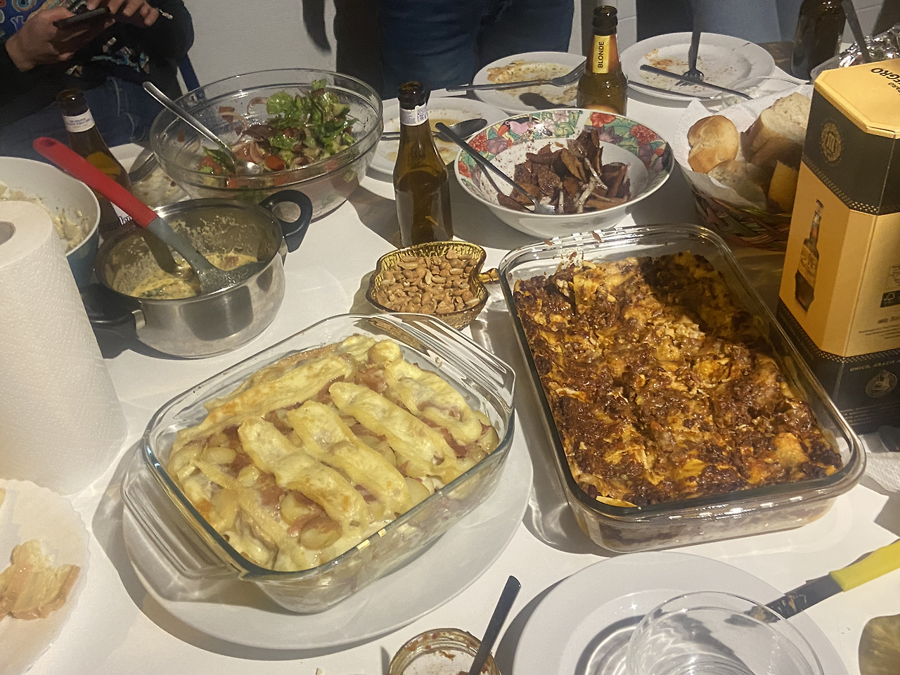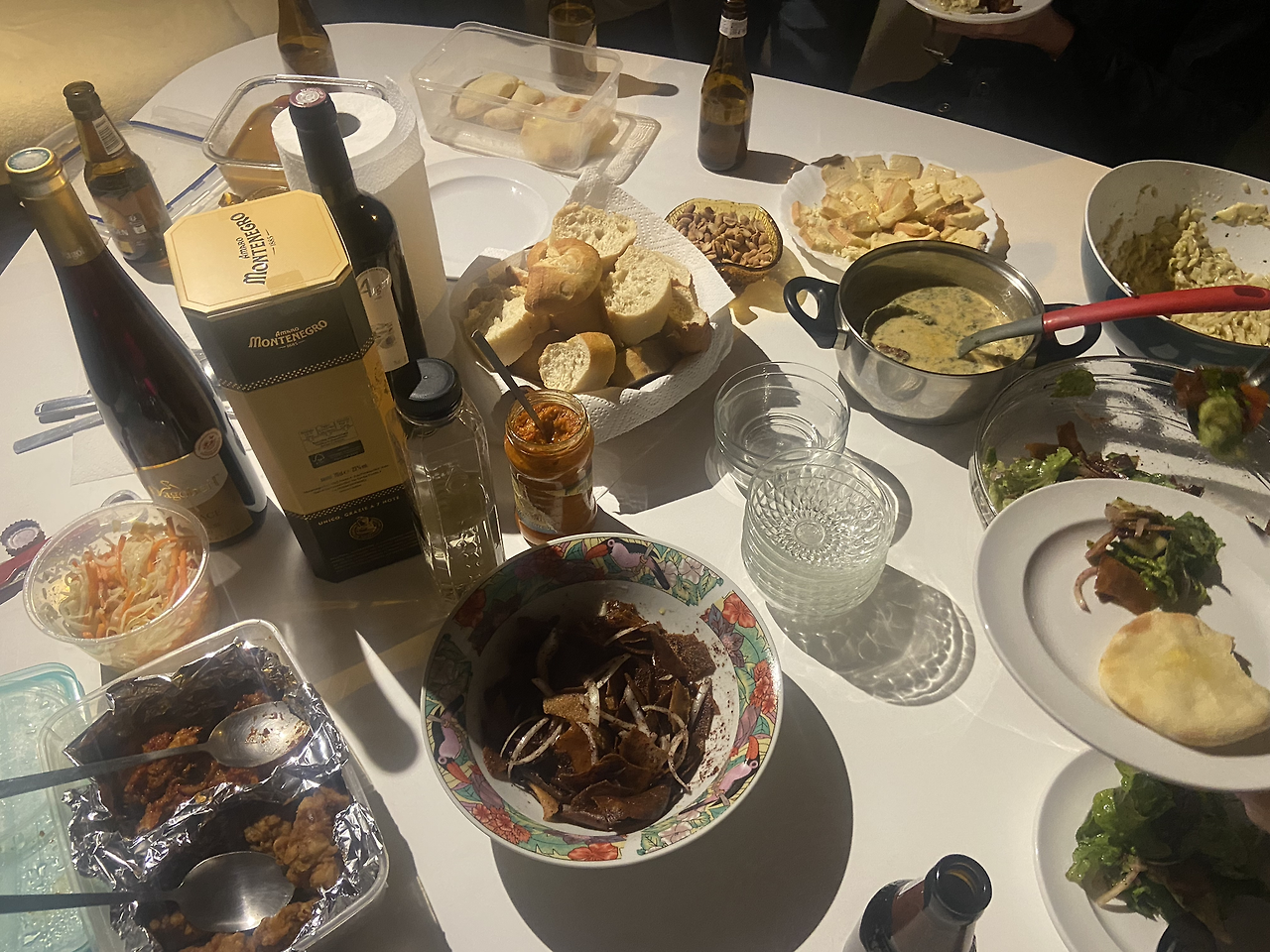 6시가 조금 지나서야 모두 도착했다. 이제 각자 준비한 요리들을 테이블 위에 세팅한다. 레바논 동료는 샐러드를 준비했다. 바삭하게 튀긴 얇은 크리스피 한 빵을 넣은 새콤한 샐러드였다. 다채로운 재료들이 듬뿍 들어가서 새콤한 맛에 다양한 텍스쳐가 있어서 매우 맛있었다. 조지아 동료는 치즈빵을 구워왔다. 쫄깃하고 아직 따뜻해서 먹기 좋았다. 페루 친구는 오렌지주스에 익힌 고구마를 가져왔는데 너무 달아서 디저트로 먹는 게 나을 것 같아 나중으로 미뤄뒀다. 이탈리아 동료는 라자냐를 구워왔는데 라구소스에 고기가 아주 듬뿍 있어서 그런지 약간 드라이했다. 지난번 파티에도 이 친구가 가져온 라자냐를 먹었었는데 그날보다 조금 맛이 부족했다. 프랑스 동료는 치즈플래터, 뭔가 샐러드, 그리고 다른 프랑스인은 감자, 치즈, 햄등을 넣은 딱뜨어쩌고를 준비해 왔다. 호스트인 루마니아 동료는 각종 재료들(샐러드, 오믈렛 등등.. 조금 생소한 재료)을 넣은 수프와 어머님이 만들어주신 피망과 비건재료로 만든 스프레드를 준비했다. 그리고 내 양념치킨들이 있었다.