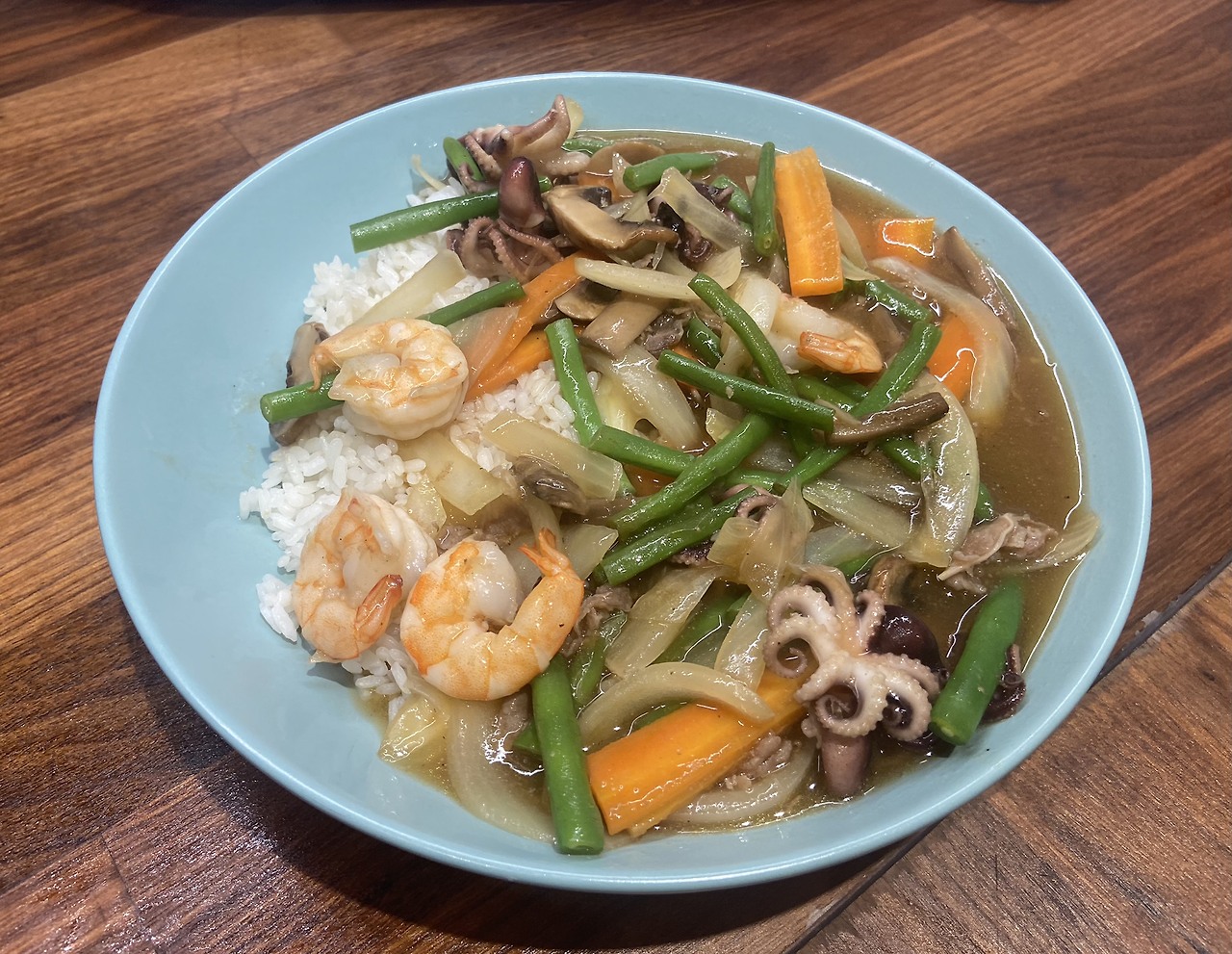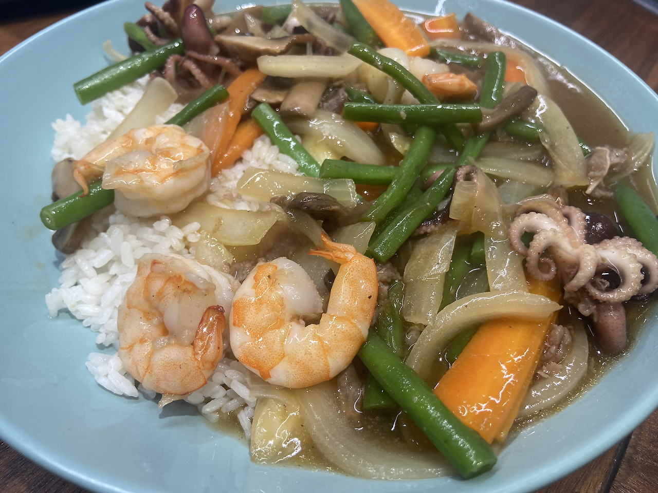 평소에는 그냥 식용유를 두른 채 볶아내는데, 조금 다르게 하고자 이 날은 식용유에 고추기름을 섞어주었다. 약간의 풍미를 더해주기 위해서랄까.(약간의 고추기름으로는 매운맛은 나오지 않는다.) 그런 후, 채소들을 넣고 볶아주면서, 새우, 주꾸미, 소고기 모두 넣고 한데 볶아준다. 어느 정도 익어갈 때, 굴소스 1, 간장 0.5, 참기름 0.1 정도 비율로 넣어준 후, 모두 잘 섞어주고 볶은 재료들이 살짝 잠기기 직전까지 물을 붓는다. 물이 부글부글 끓기를 기다리면서 전분물을 준비한다. 말 그대로 전분을 물에 풀어두는 거다. 팬에서 재료들이 끓기 시작하면 전분물을 붓고 빠르게 저어준다. 시간이 좀 지나면 걸쭉해지기 시작한다. 그러면 완성이다.