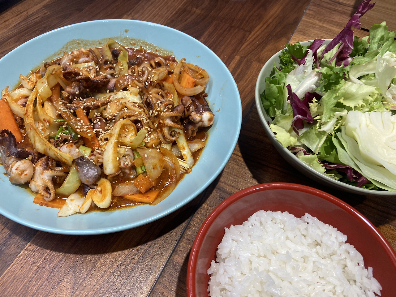 그릇에 담고 예쁘게 참깨를 뿌려내 주면 쭈꾸미볶음 완성이다. 밥은 역시 흰쌀밥을 준비한다. (어차피 잡곡은 없어서 흰쌀밥뿐이지만...) 조금 매운 고춧가루를 사용해서 매콤한 맛이 맘에 든다. 밥과 함께 매콤한 쭈꾸미를 먹어본다. 제법 쫄깃하다. 크기가 작아서 자를 것도 없이 한입 크기이다. 매콤한 맛에 땀이 나기 시작한다. 맛있다는 거다. 양념을 밥에 얹어 비벼 먹는다. 참기름을 가져와 살짝 뿌려준다. 참기름의 고소함에 매운맛이 조금은 사그라드는 듯하지만 내 혀는 여전히 얼얼하다. 엄마가 해주던 봄날의 싱싱한 한국 쭈꾸미와 비교하기는 많이 부족하지만, 기대도 못했던 쭈꾸미를 만난 덕에 조금은 마음까지 따뜻해지는 한 끼였다.