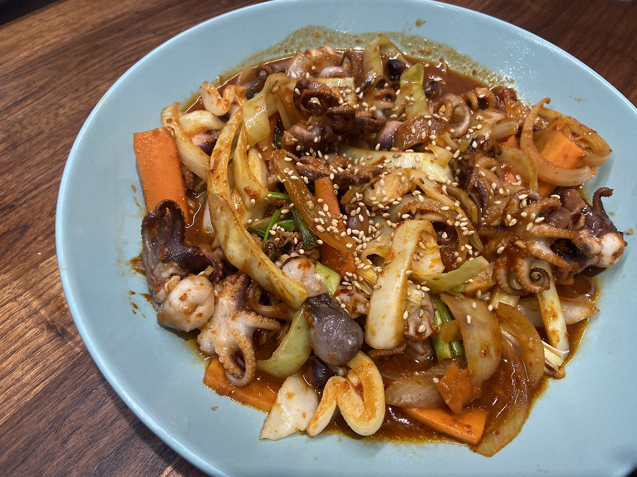아무래도 냉동 쭈꾸미로 샤부샤부처럼 데쳐먹기는 맛이 아쉬울게 뻔했다. 그럴 땐 역시 양념이다. 싱싱함이 부족할 땐 양념 듬뿍 넣어 그걸 가려주면 되는 거다. 전에 사 왔던 냉동낙지는 쫄깃함이 조금 부족해서 아쉬웠는데, 쭈꾸미는 어떨지 조금 기대가 됐다. 양념을 준비한다. 뭐 별거 있겠는가. 고추장, 고춧가루, 간장, 설탕, 다진 마늘, 후추면 뚝딱이다. 냉동 쭈꾸미를 해동시켜 준다. 귀찮을 땐 물에 담근 채 전자레인지에 살짝 돌려줘버린다. 나만의 비법이다. 너무 오래 돌리면 익어버리니, 물의 온도가 올라가면서 얼어버린 쭈꾸미가 녹을 정도만 돌려줘야 한다. 냉장고를 뒤져 채소를 준비한다. 양파, 쪽파, 당근 정도면 충분한데 양배추가 남아있어서 분명 잘 어울릴게 뻔했기에 양배추도 냉장고에서 함께 꺼낸다. 채소들을 적당한 크기로 잘라준다. 준비는 끝이다. 이제 팬을 꺼내서 기름을 두루고는 쭈꾸미를 넣고 볶아준다. 조금 익어갈 무렴, 양파와 당근, 양배추를 넣고 볶아내 준다. 거의 익어갈 무렴 만들어둔 양념장을 넣고는 볶아준다. 양념이 탈까 걱정된다면 살짝 물을 넣어주어도 좋다. 마지막으로 쪽파를 넣고는 휘리릭 한 번 섞어주며 마무리한다.