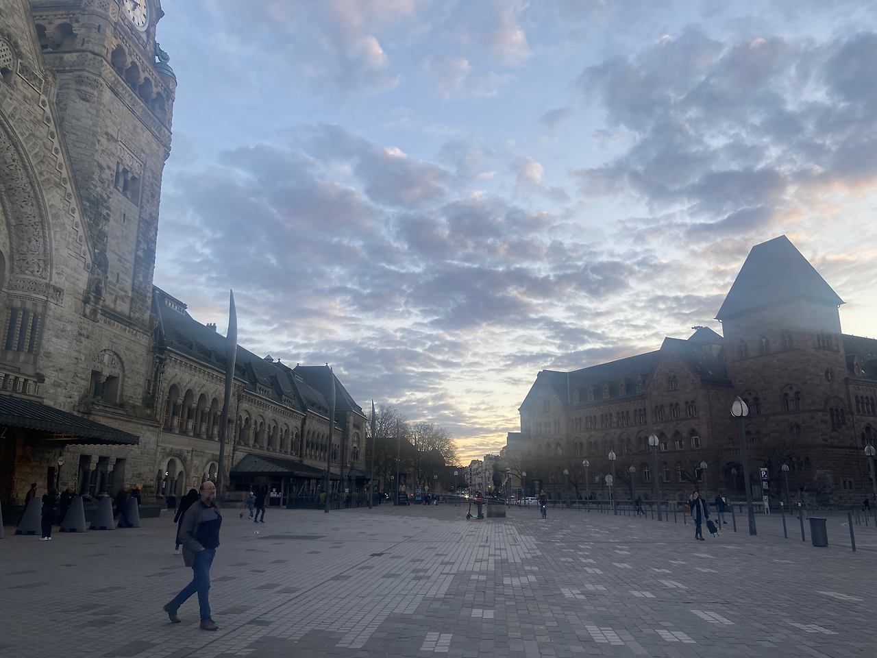 확인 후, 바로 기차를 예매하고 뒤늦게 일주일간 메스에서 보내기 위한 짐을 챙겼다. 다음 주에 연구실에서 발표를 해야 하는데, 준비를 하나도 안 해서 메스에서 낮에 봉사활동을 하고 밤에 작업을 해야지-라는 마음으로 나의 무거운 게이밍 노트북까지 챙겼다. 대충 짐을 꾸역꾸역 챙기고는 급하게 예매한 기차시간에 늦지 않게 일찌감치 역에 도착했다. 프랑스에서는 출발 20분 전쯤에 전광판에 기차의 플랫폼 번호가 뜬다. 그래서 사람들이 플랫폼 앞에서 서성이며 다들 기다리고 있다가 뭔가 하나가 뜨면 급 플랫폼으로 이동하기 시작한다. 기차가 오기를 기다리는데 누군가 다가왔다. 예전에 스트라스부르 한국 성당에서 뵈었던 분이었다. 그분도 나와 같은 곳을 간다고 했다. 자유석 기차라서 둘이 함께 옆자리에 앉아 메스를 향해 갔다. 초반에는 몇 마디를 좀 하다가, 더 할 말이 없어서 둘 다 서로 이어폰을 끼고 자유롭게 나는 자고, 그분도 그분 나름대로 시간을 보내다 보니 어느덧 메스에 도착했다. 기차역에서 나와서 처음 본 메스는 기차역도 예쁘고 매우 깔끔하고 정돈된 도시 같았다. 건물의 스타일도 내가 있던 스트라스부르와는 다르고, 좋은 도시 같았다.
